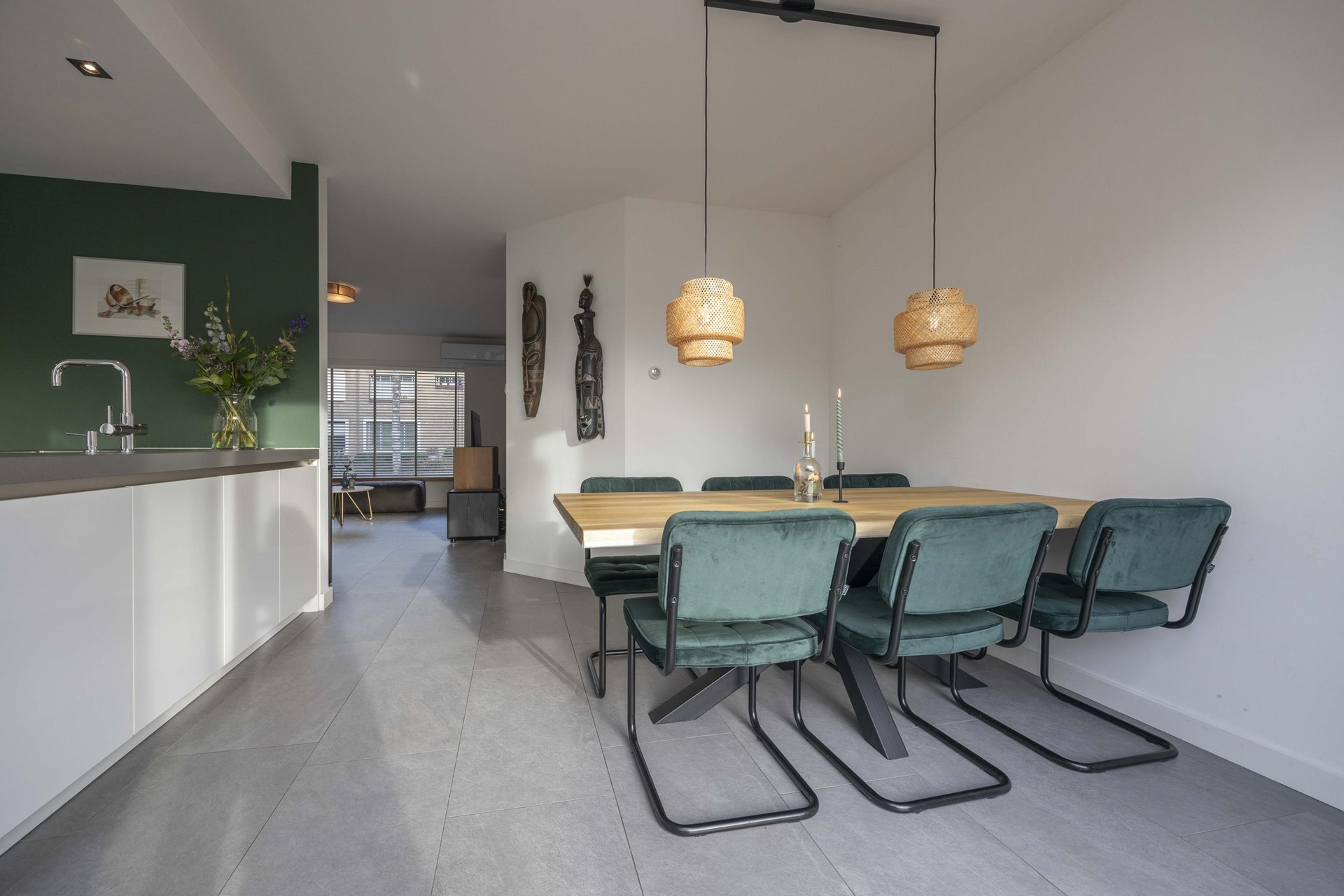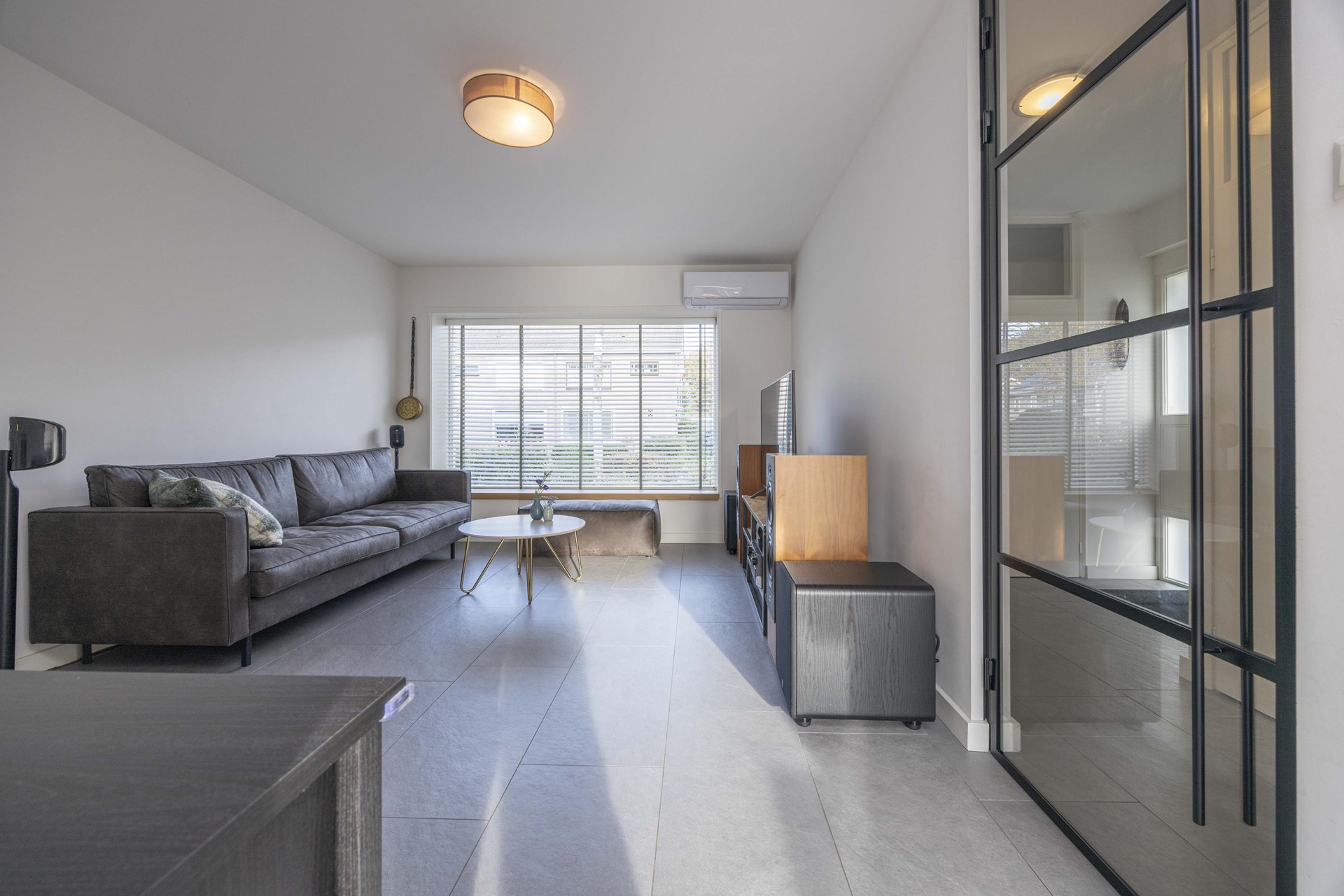 De ruimtelijke woonkamer ademt licht en rust. Grote ramen en openslaande deuren brengen het daglicht royaal naar binnen, terwijl de airco ervoor zorgt dat je hier het hele jaar door in aangenaam klimaat leeft. Hier ervaar je dagelijks het ultieme gevoel van thuiskomen — open, comfortabel en uitnodigend.
