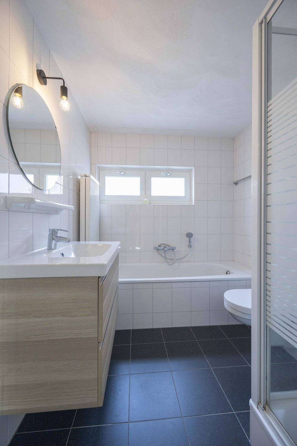 De badkamer is een plek om te ontspannen: volledig betegeld, voorzien van een ligbad, douche, toilet en wastafel met stijlvol meubel. Luxe, rust en comfort — precies zoals een badkamer hoort te zijn.