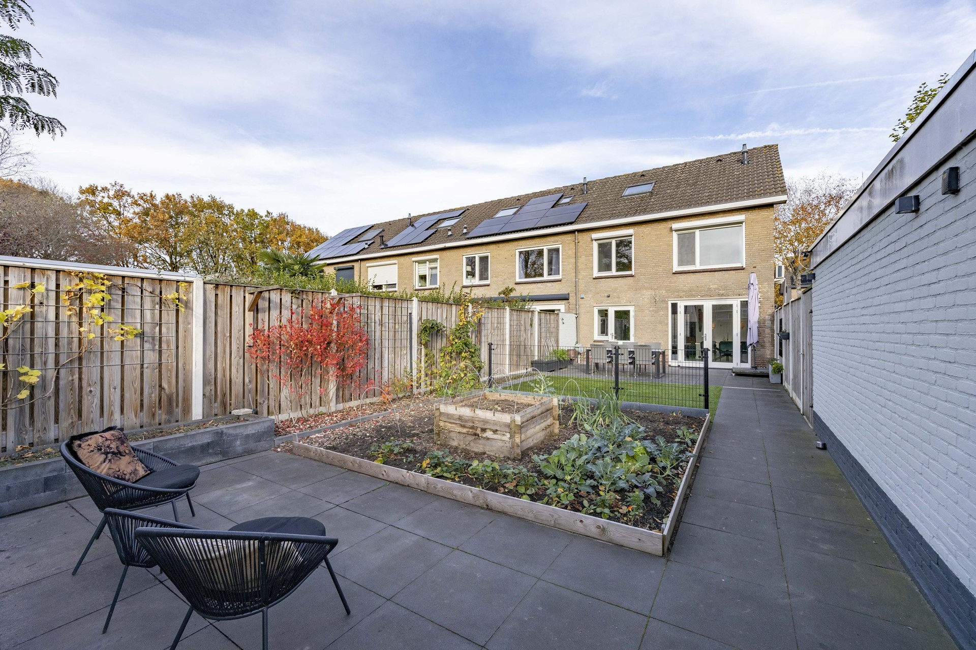 De diepe tuin op het zonnige zuid/zuidwesten is een waar buitenparadijs. Twee terrassen, groene invulling bieden ruimte voor spel, ontspanning en lange zomeravonden. Van een rustige ochtendkoffie tot diners aan lange tafels — dit is genieten.
