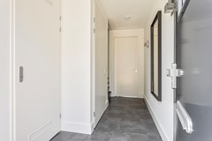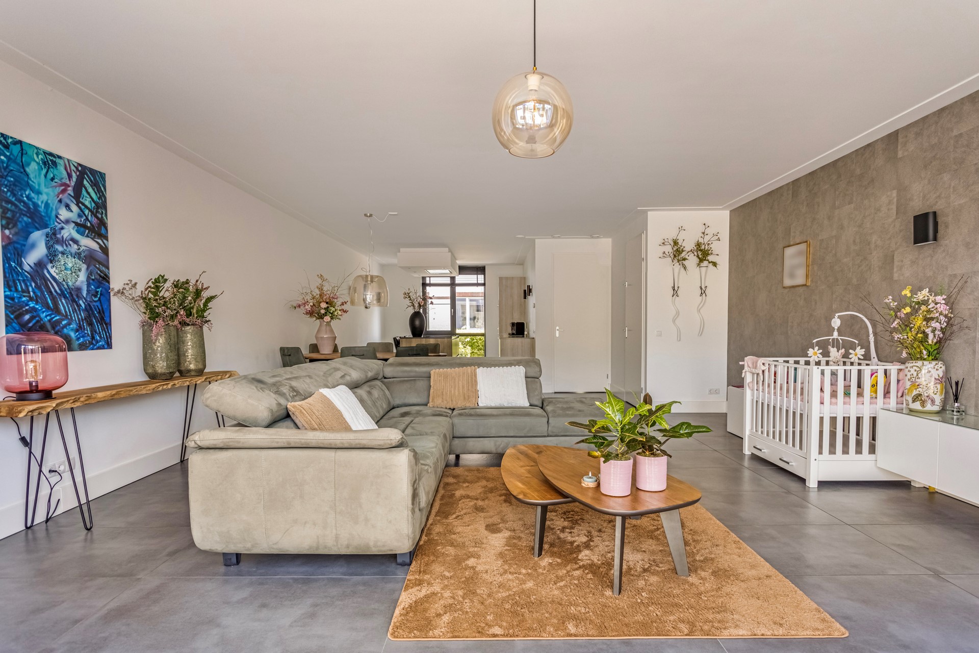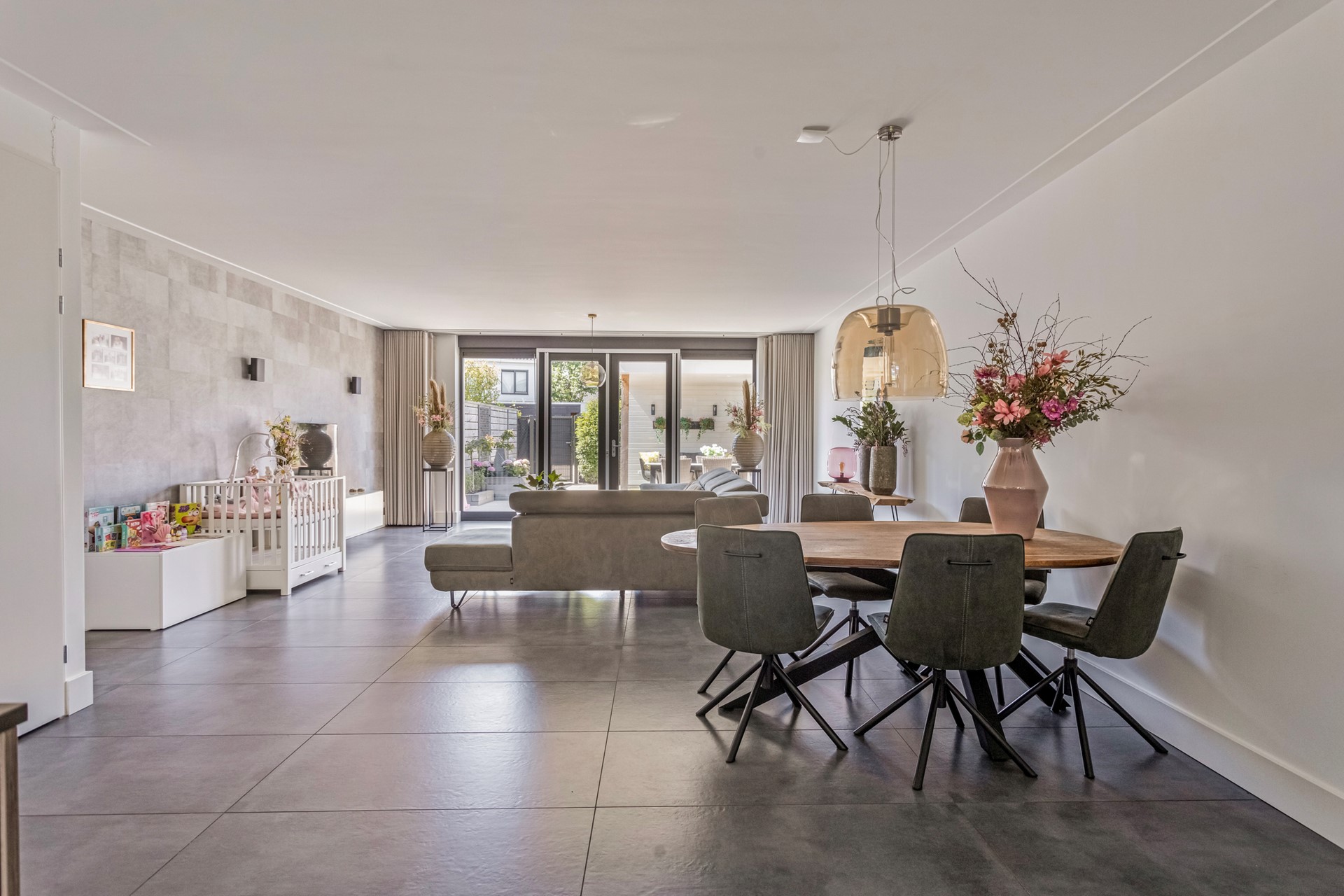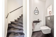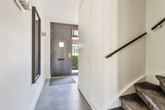 Entree: Via de vensters in en naast de voordeur valt lekker veel daglicht de entree binnen. Je vindt hier de meterkast, het toilet en de trap naar de eerste verdieping. Op de vloer liggen grijze tegels, met vloerverwarming, die mooi doorlopen over de gehele begane grond.