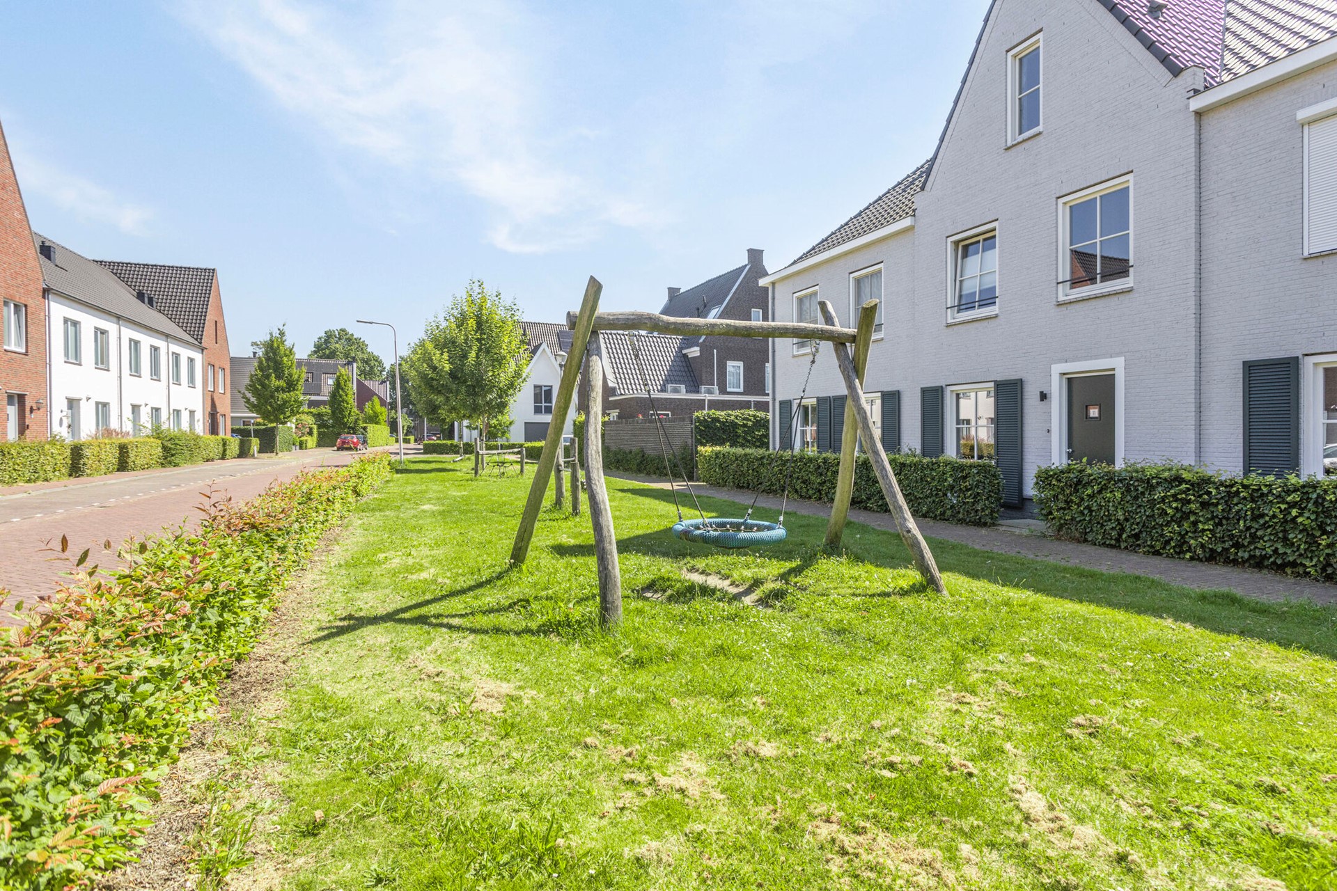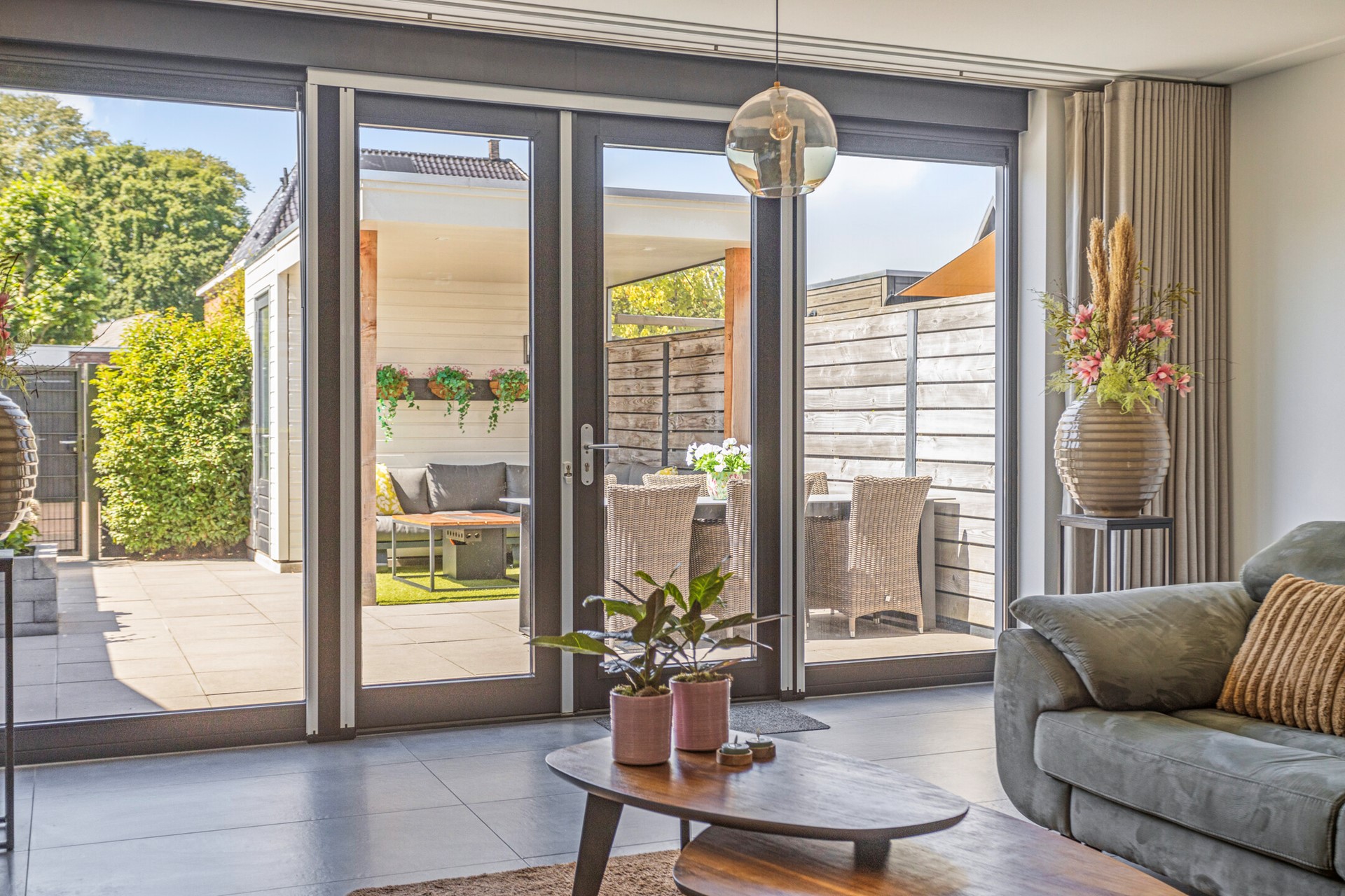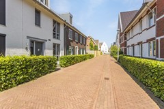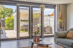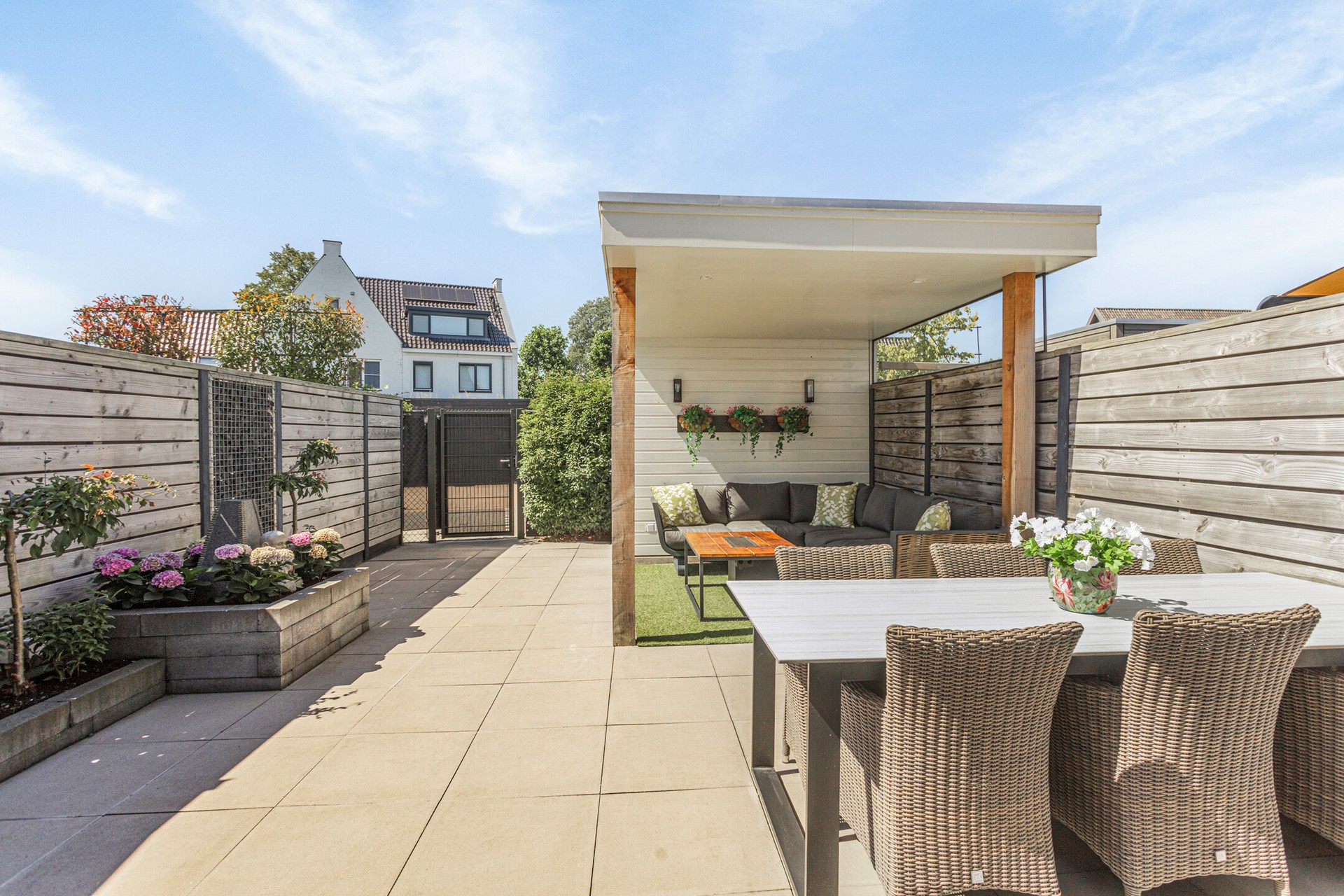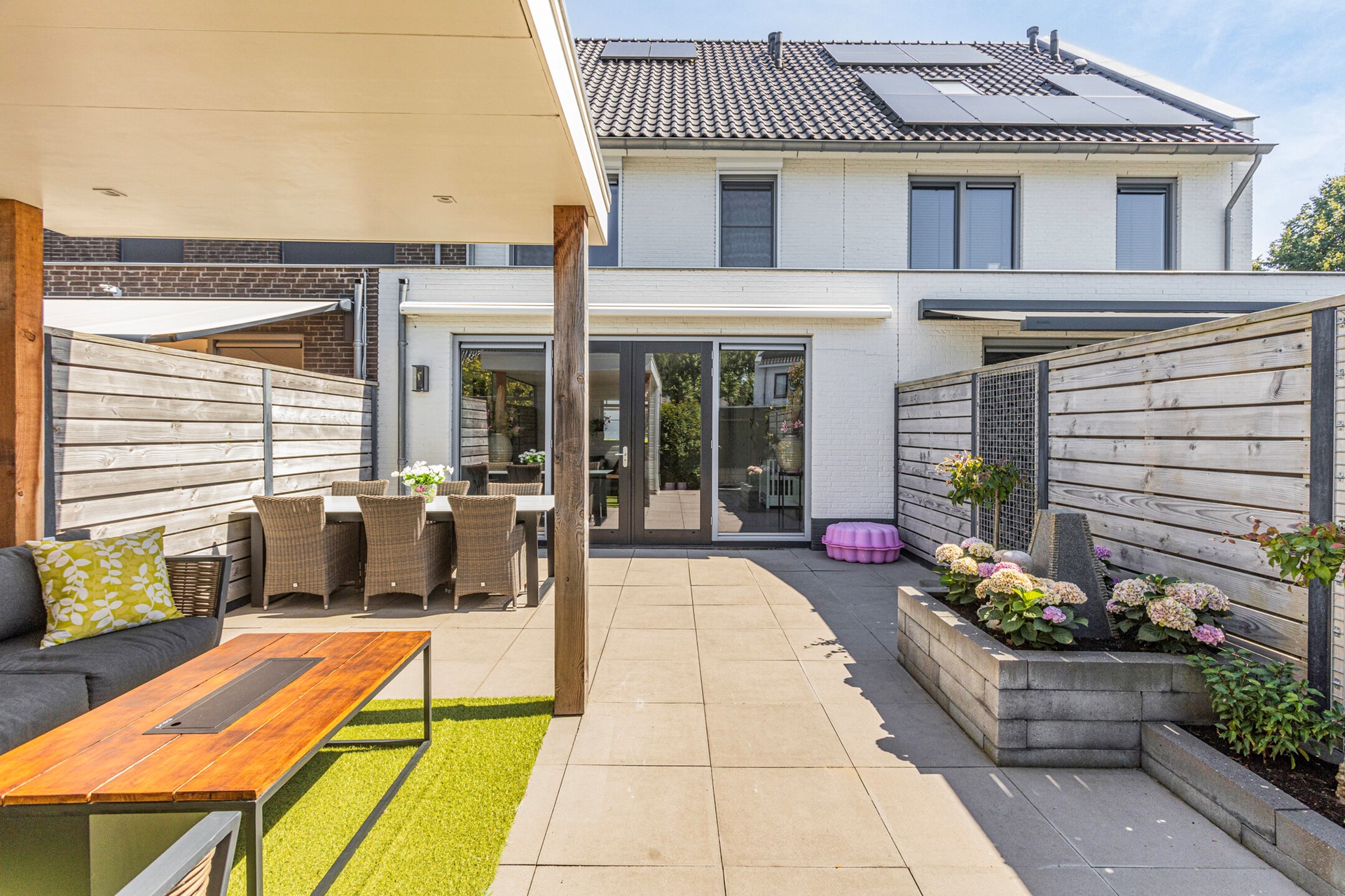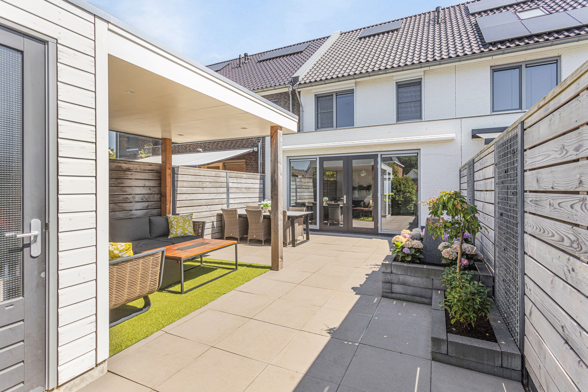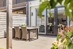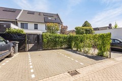 De heerlijke achtertuin ligt op het westen en vangt dus tot laat in de avond veel zonnestralen. Ook tijdens een regenbuitje kun je, onder de royale overkapping (10 m2), optimaal blijven genieten van je tuin. De tuin is onderhoudsvriendelijk aangelegd met grote vierkante tegels. Door het ontbreken van directe achterburen biedt de tuin extra veel privacy. De berging naast de overkapping is ideaal voor het opbergen van je tuinspullen en het parkeren van je fiets. Je auto parkeer je op je eigen parkeerplek achter de tuin. Vanuit de tuin is deze toegankelijk via de poort naast de berging. Vanaf de straat is de parkeerplek toegankelijk via het mandelig terrein, wat is voorzien van een elektrische poort.