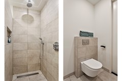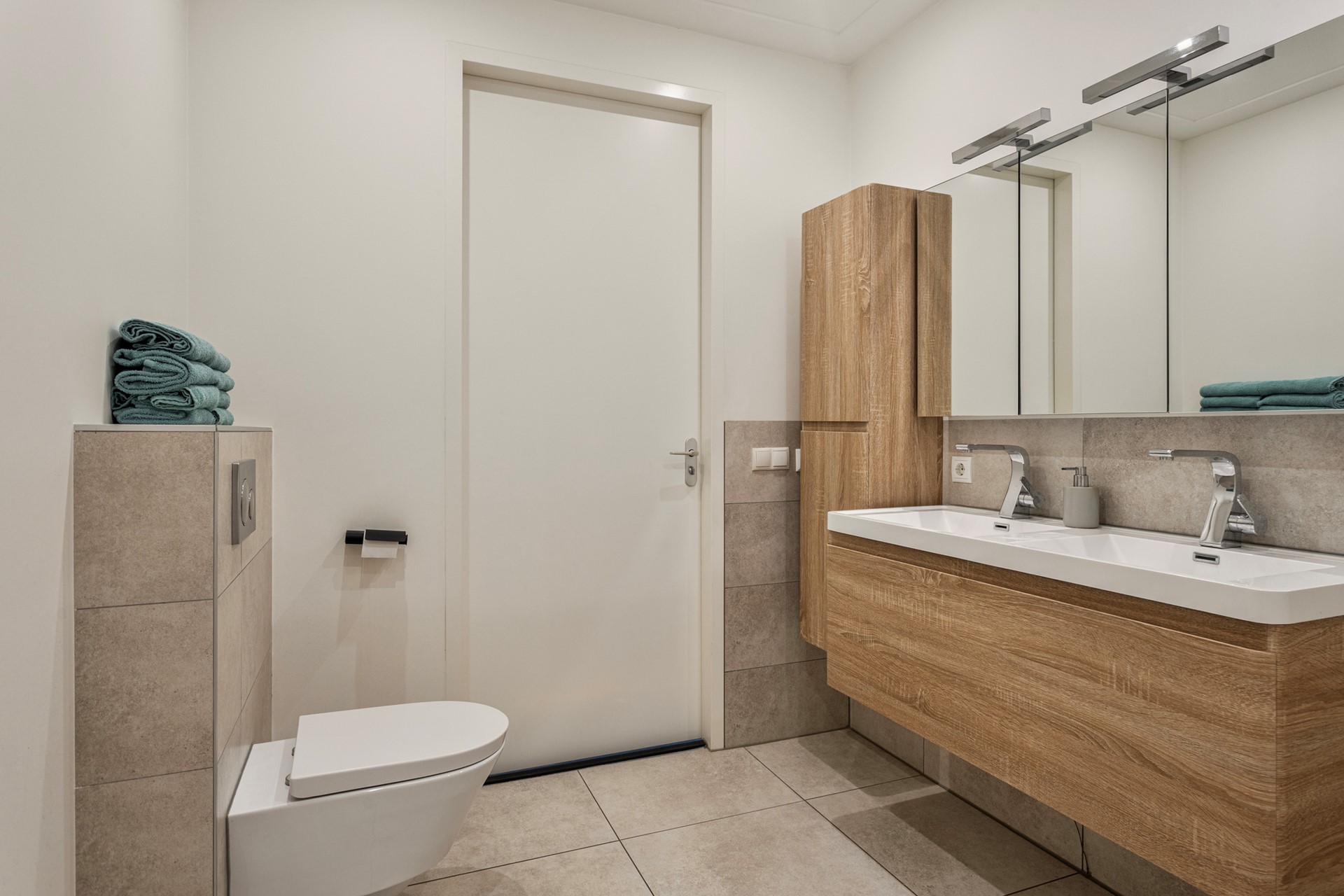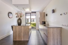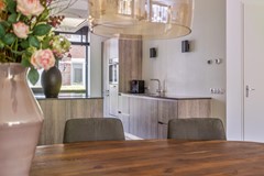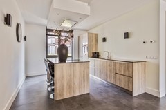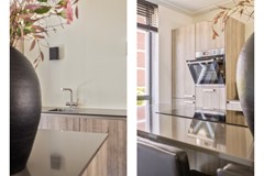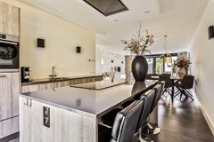Keuken: De strakke moderne keuken bevindt zich aan de voorzijde van de woning. Er is een groot kookeiland voorzien van een inductiekookplaat en een geïntegreerde afzuigkap. Tegen de wand vind je het aanrecht met de spoelbak, een Quooker en een vaatwasser. In de kastenwand ernaast de koel-vriescombinatie en de combi-stoomoven/combi-magnetron op ooghoogte. Hier bereid je allerlei lekkere gerechten voor je hele familie en al je vrienden, terwijl zij al lekker van een drankje genieten aan de bar van het kookeiland.