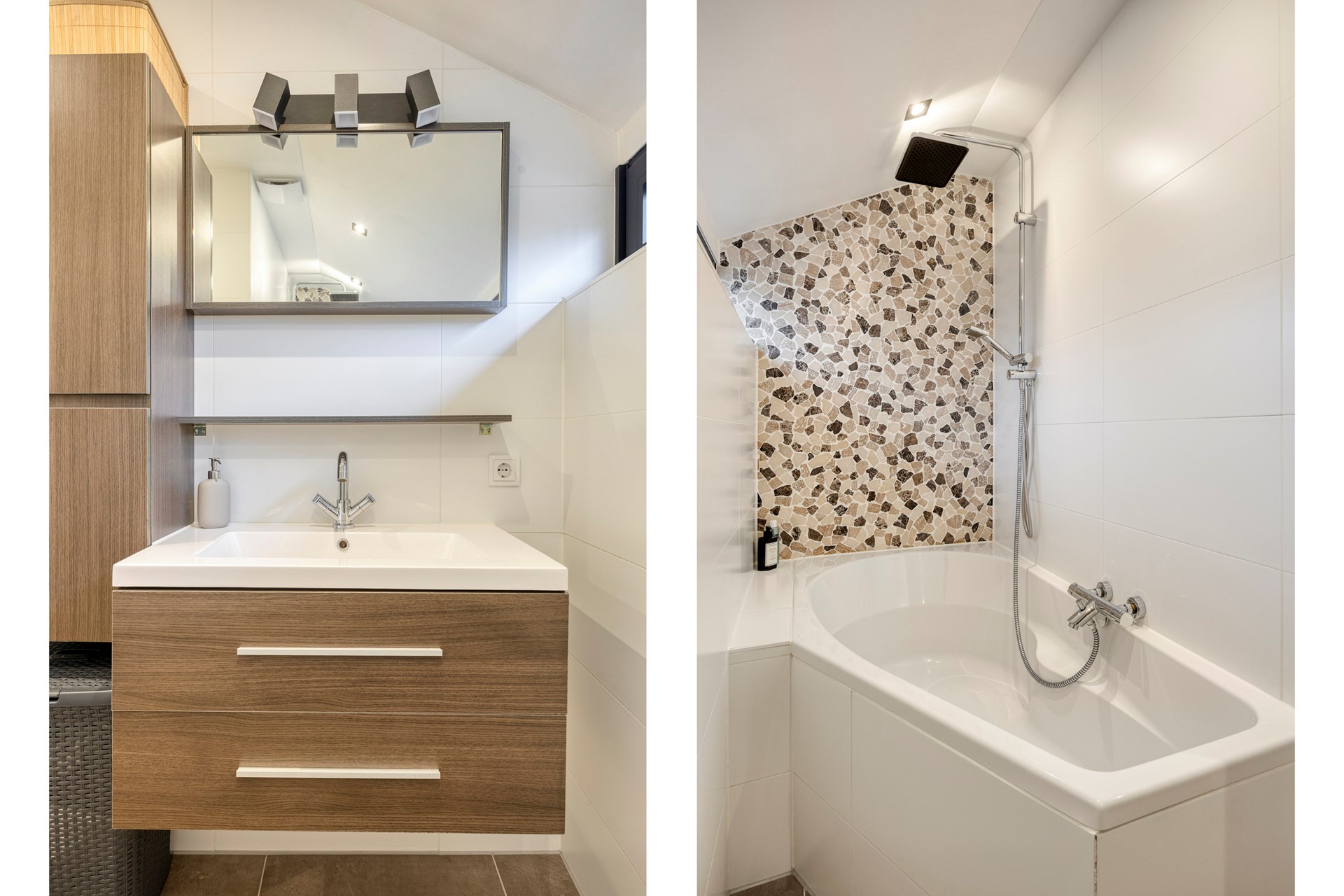 De verrassende badkamer op de eerste verdieping is praktisch en comfortabel ingericht met een ligbad (met douche), wastafelmeubel en toilet. Fris, functioneel en precies wat een gezin nodig heeft.