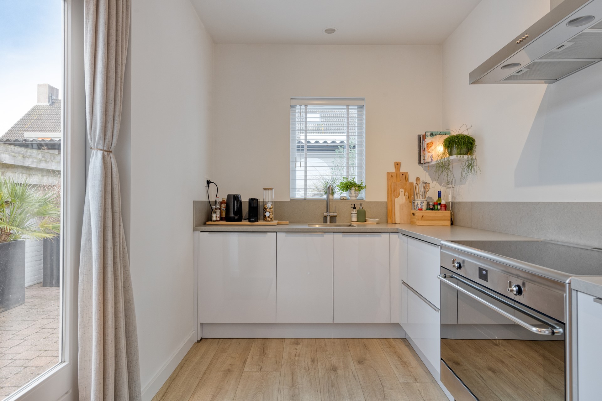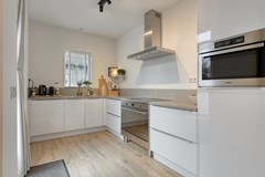 Aansluitend ligt de volledig nieuwe keuken (2022), gesitueerd in de bestaande uitbouw. De keuken is uitgevoerd in een strakke witte kleurstelling met een licht composiet werkblad en voorzien van inbouwapparatuur van Whirlpool, waaronder: