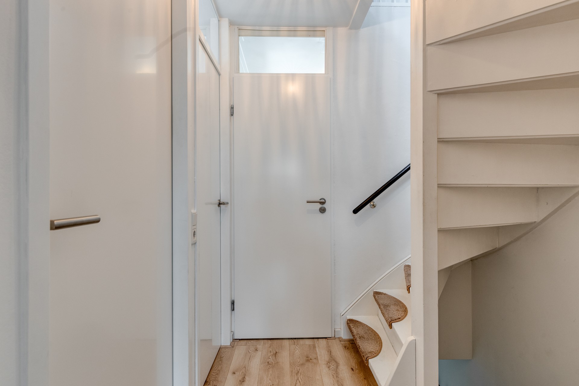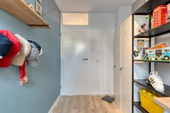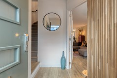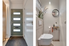 Via de overdekte entree betreed je de woning in de ruime hal met vernieuwde meterkast, trapopgang en een volledig nieuwe toiletruimte. Deze toiletruimte is uitgevoerd met een wandcloset, fontein, lichte wand- en vloertegels en een raampje voor daglicht en ventilatie.
