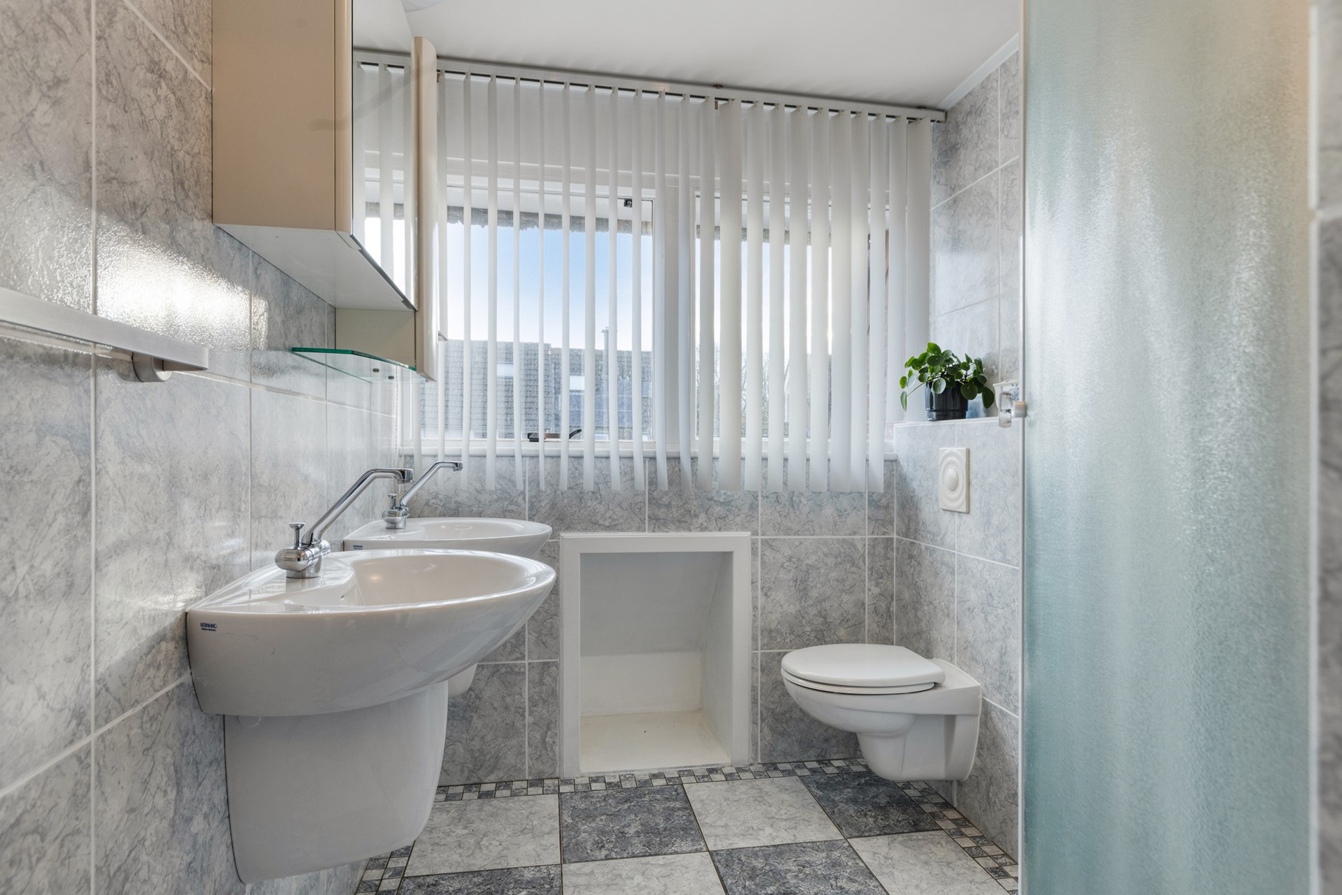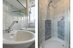 De badkamer is uitgevoerd met een toilet, twee wastafel met planchet en een doucecabine met een nieuwe thermostaatkraan en regen- met handdouche. De brede raampartij over de volle breedte voor daglicht en natuurlijke ventilatie