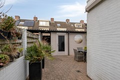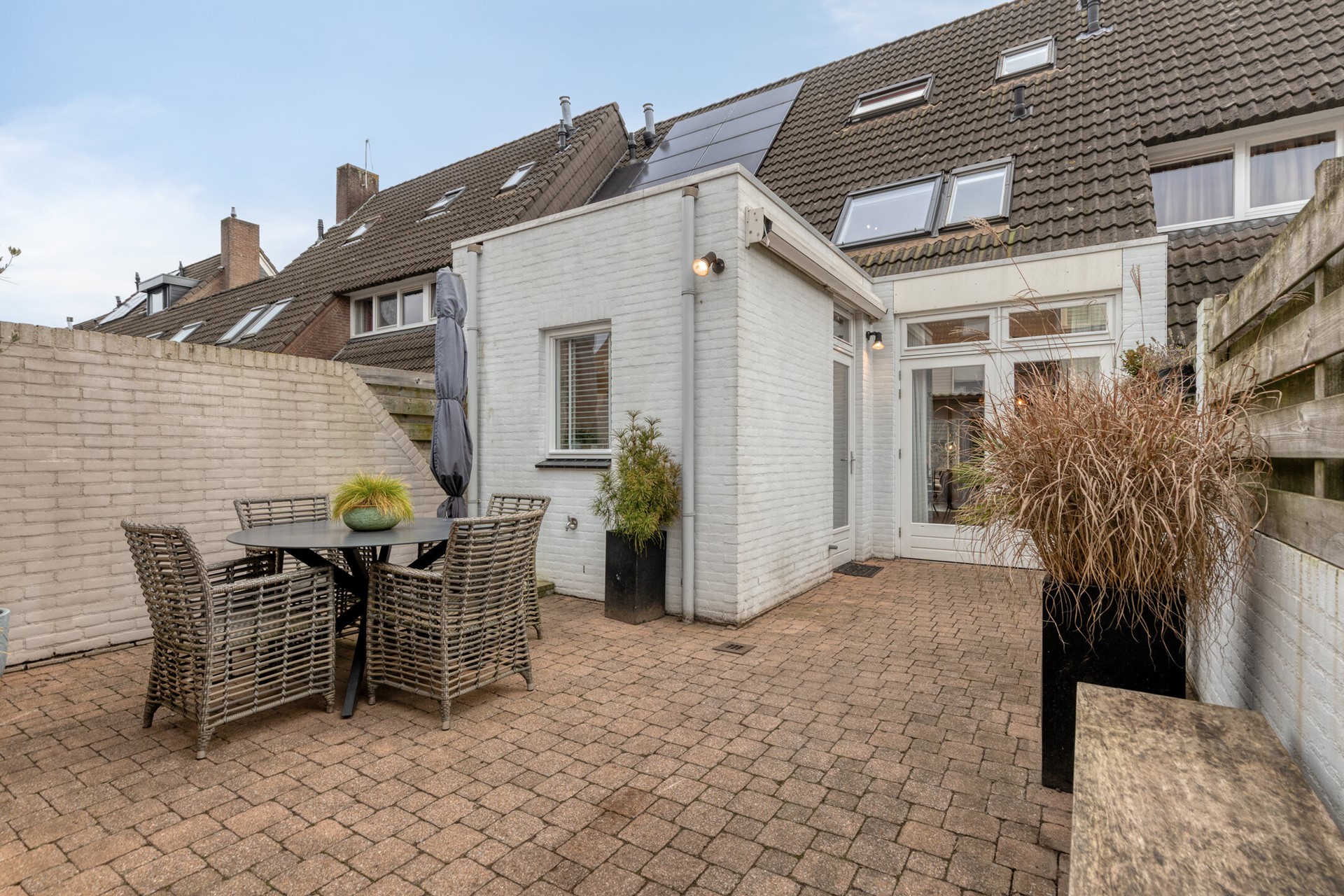 De geheel omsloten achtertuin is volledig bestraat en beschikt over:
