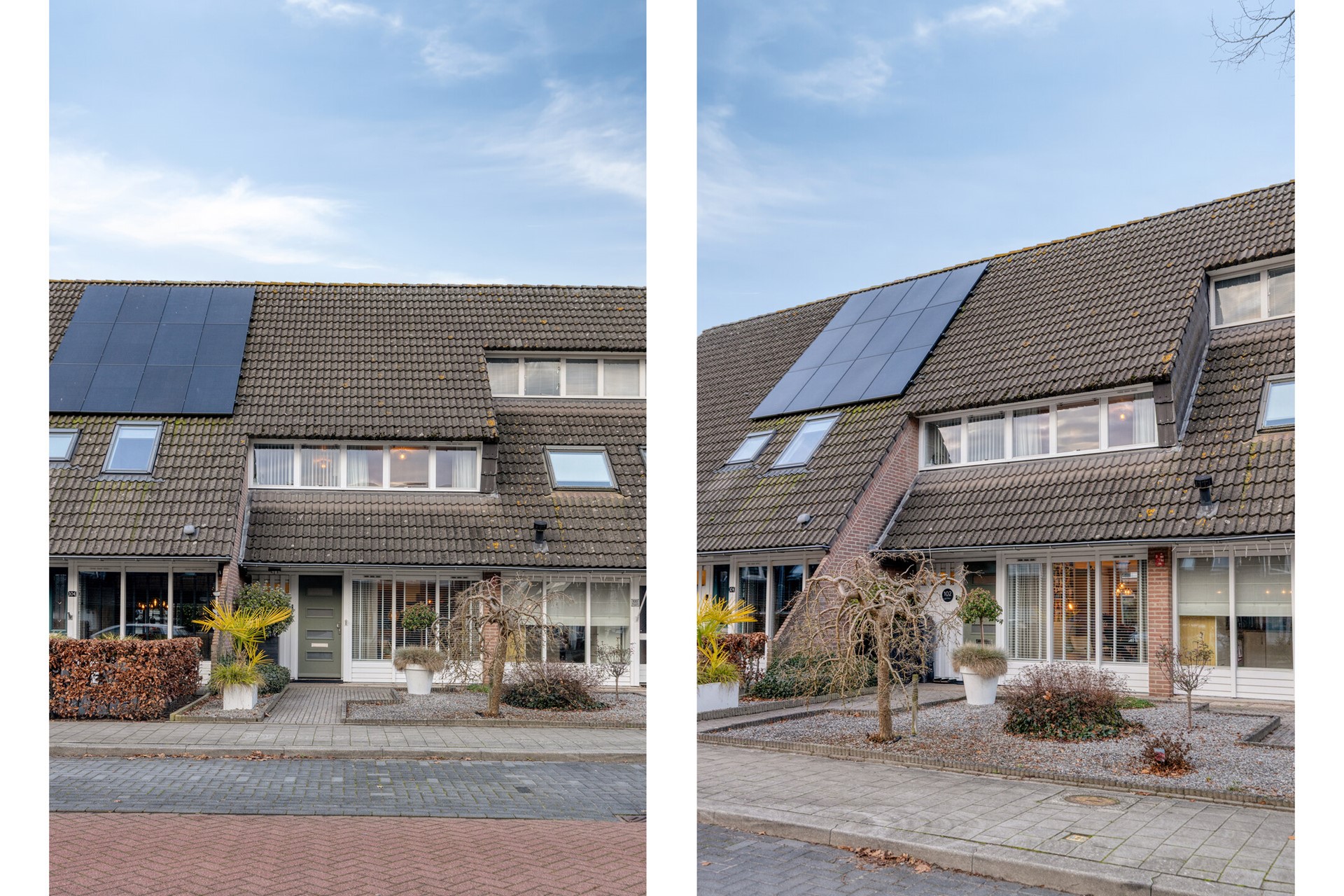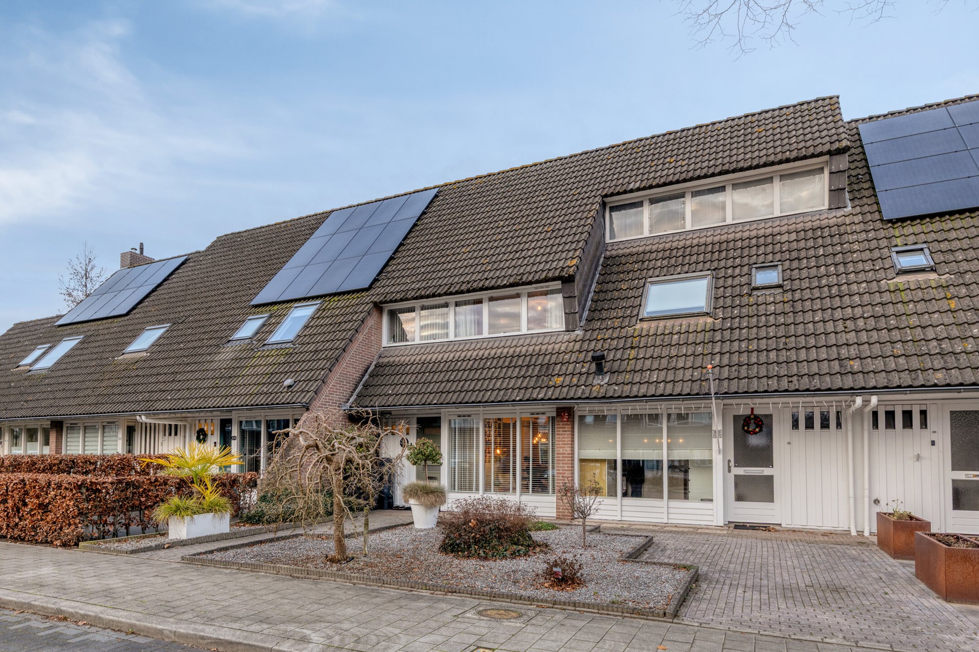 De voortuin is netjes aangelegd met grindperken, beplanting en een looppad naar de (nieuwe) voordeur.