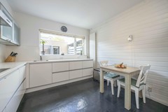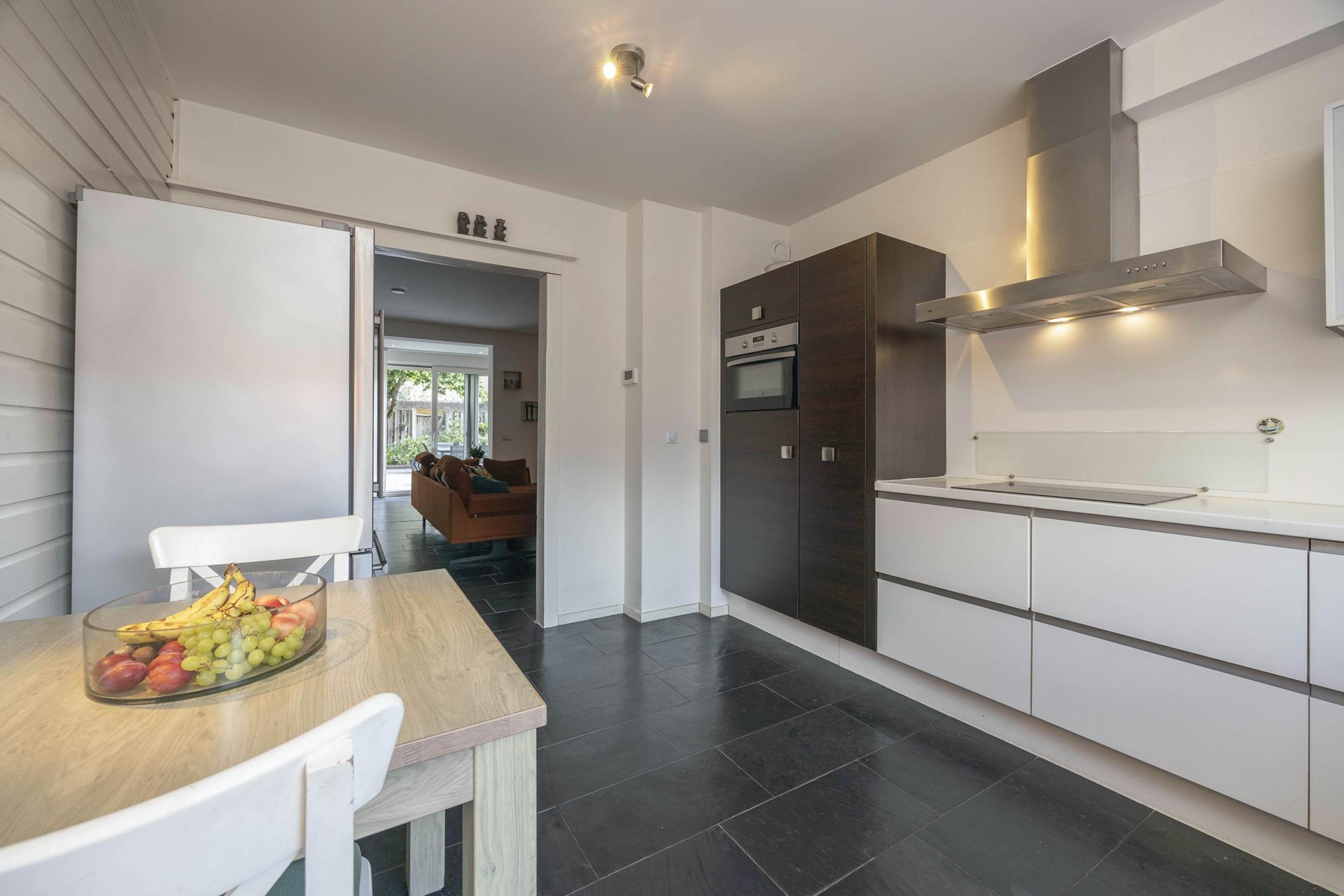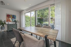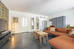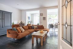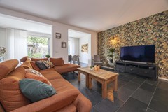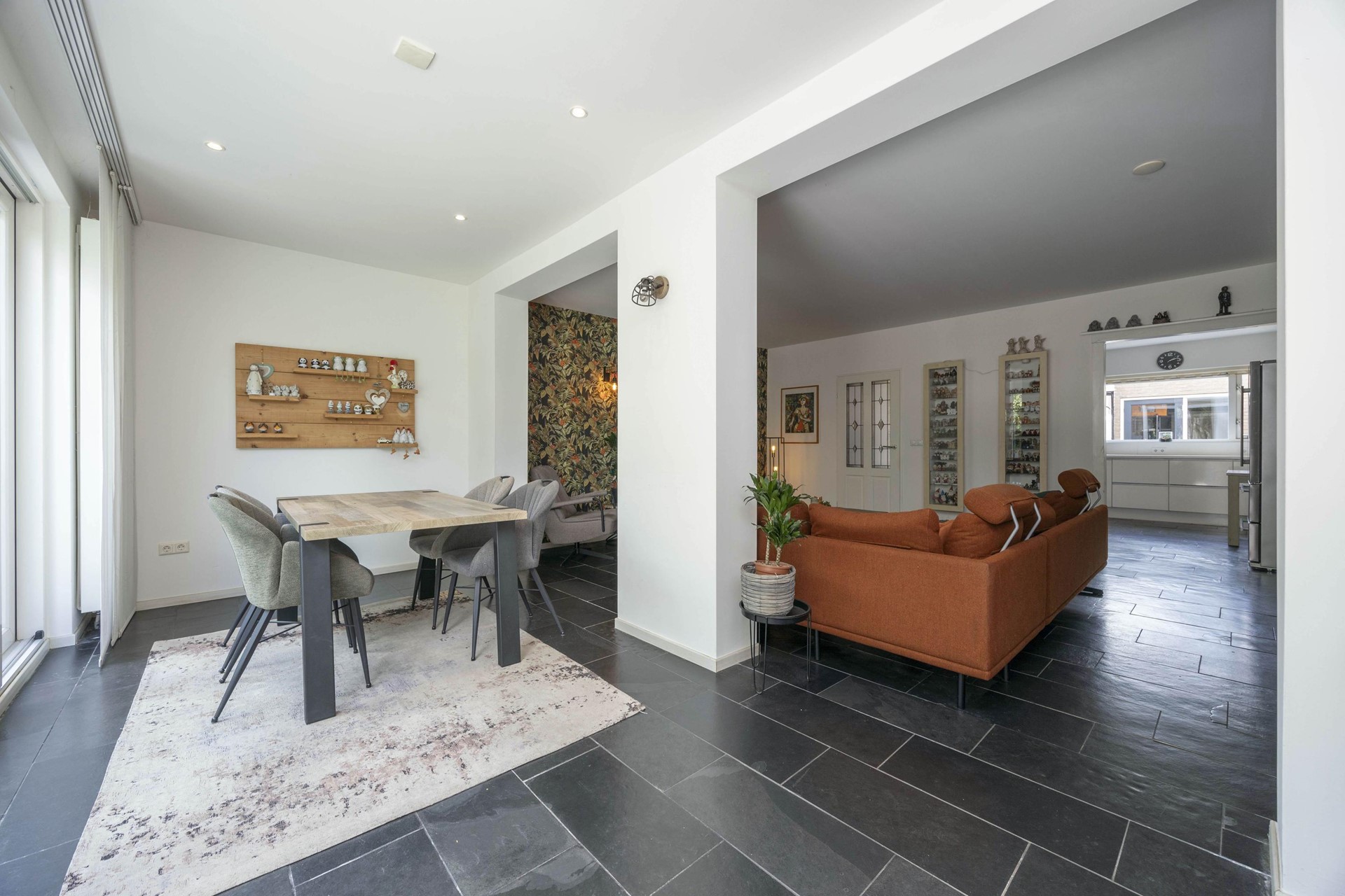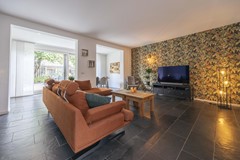 Stap binnen in een strak afgewerkte woonkamer, waar de leisteen tegelvloer en de licht gestucte muren zorgen voor rust en eenheid. De uitbouw aan de achterzijde creëert een verrassend ruime leefruimte, met een zee van licht dankzij de grote pui. Hier vloeit binnen moeiteloos over in buiten, de perfecte plek voor gezellige diners, spelende kinderen of een ontspannen avond met uitzicht op de tuin.