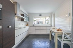 De ruime moderne witte keuken is tijdloos in zijn eenvoud, uitgerust met alles wat je nodig hebt: een inductiekookplaat, rvs-afzuigkap, combi-oven, vaatwasser en een koel-vriescombinatie. De rechte lijnen en het strakke blad maken het tot een plek waar koken vanzelf een plezier wordt. Er is ook nog ruimte voor een gezellig zitje.