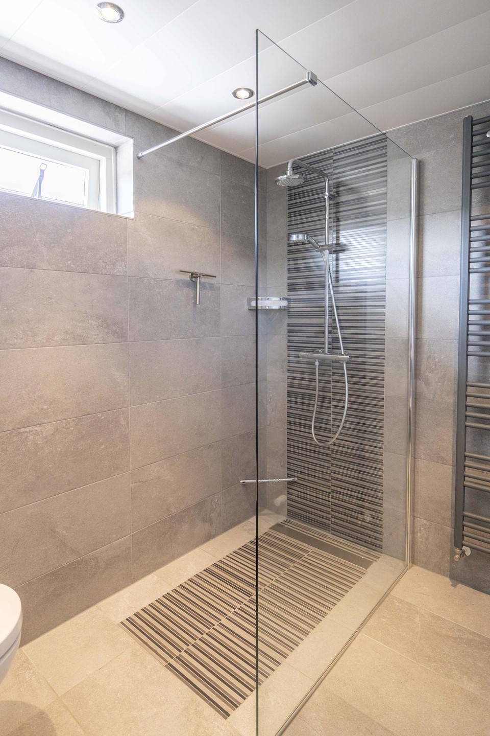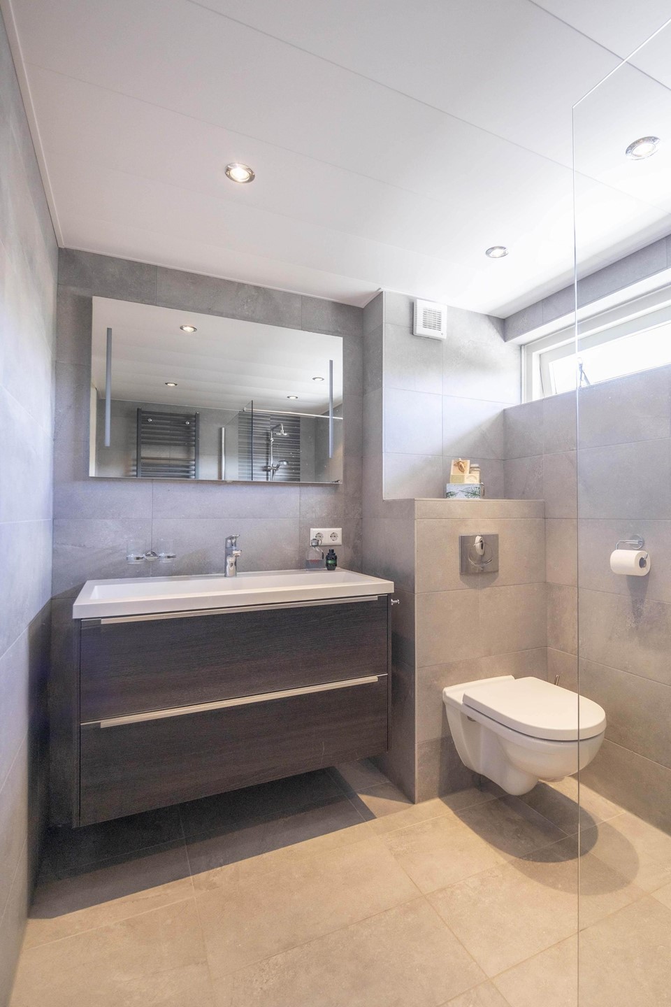 Op de eerste verdieping bevinden zich drie fijne slaapkamers, stuk voor stuk licht, ruim en rustig. De badkamer is een stijlvol geheel van grote grijze tegels, met een inloopdouche, breed wastafelmeubel en toilet. Modern, netjes en onderhoudsvriendelijk.