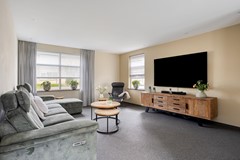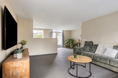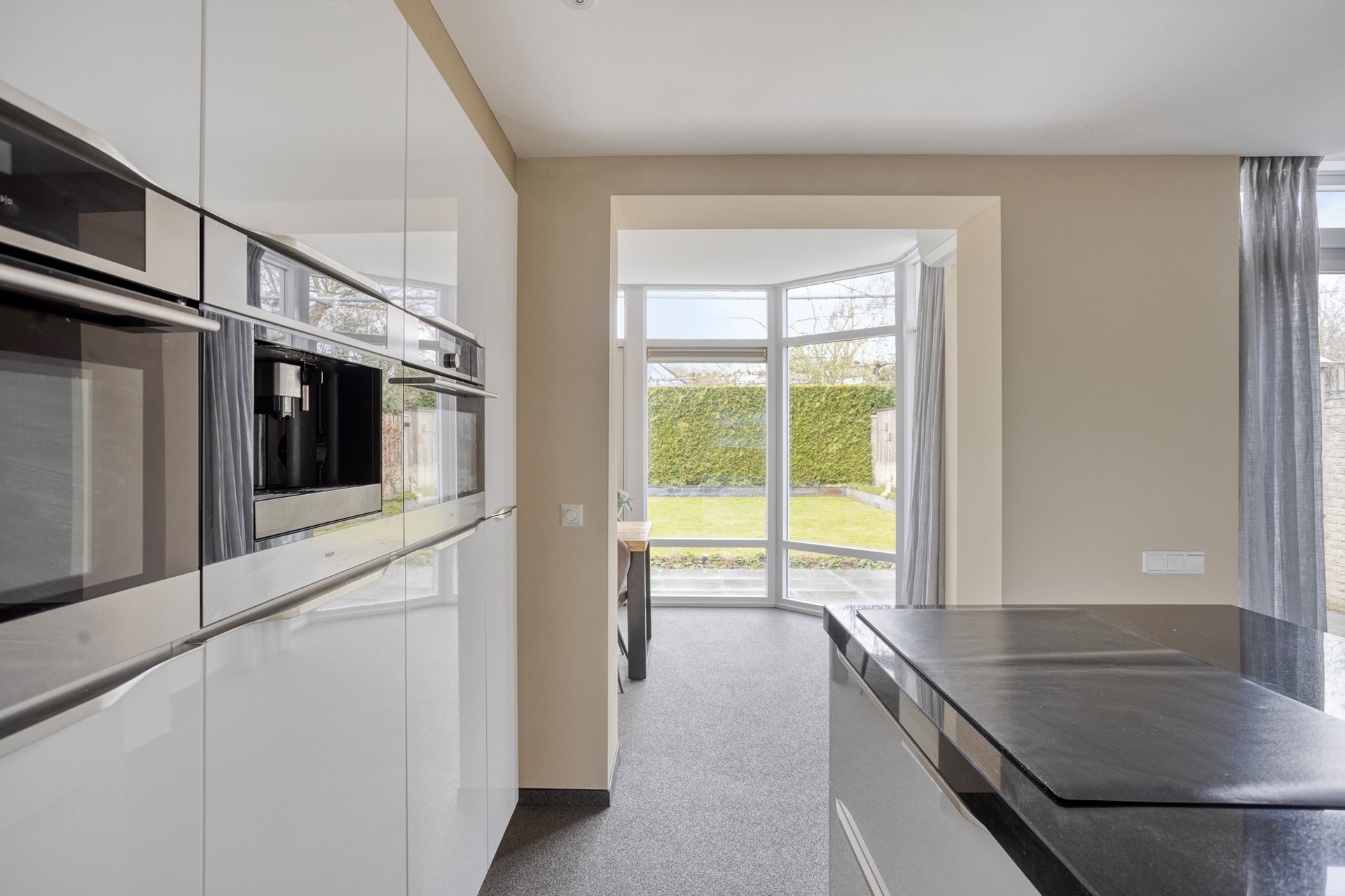 De lichte woonkamer sluit naadloos aan op de moderne open keuken met een rechte hoge kastenwand en een keukeneiland. De keuken is uitgerust met hoogwaardige inbouwapparatuur, waaronder een coffee centre, combi-oven/magnetron, stoomoven, vaatwasser, inductiekookplaat met geïntegreerde afzuiging, Quooker en twee koelkasten. Via de openslaande tuindeuren stap je zo de achtertuin in.