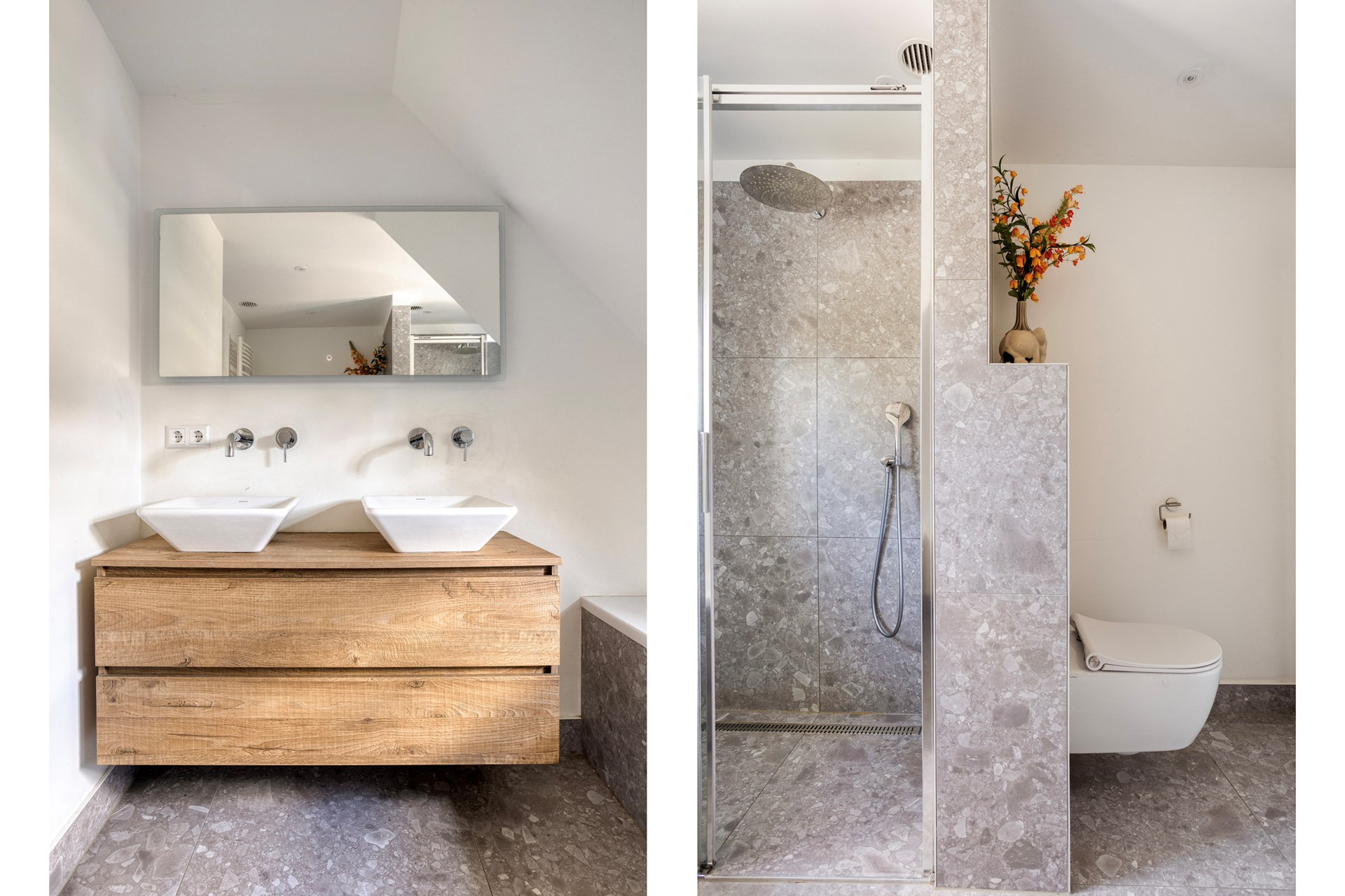Aan de achterzijde bevindt zich de royale eetkamer in de uitbouw, voorzien van grote raampartijen, airconditioning en een overvloed aan daglicht. De gehele begane grond is afgewerkt met een stijlvolle Strizo-vloer en strak stucwerk. Vanuit de eetkamer is de inpandige garage bereikbaar.