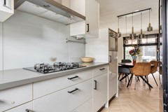 De nette keuken is een eyecatcher. Licht van kleur, voorzien van donkere grepen en een stoer grijs werkblad. Uitgerust met een gasfornuis, RVS afzuigkap, combi-oven, koelkast, RVS spoelbak en veel opbergruimte. Hier kookt u niet alleen met gemak, maar ook met plezier.