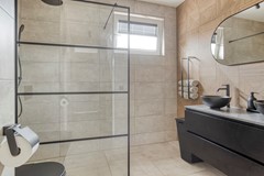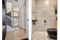 Op de eerste verdieping vindt u twee slaapkamers en een modern afgewerkte badkamer. De strakke houtlook laminaatvloer en de rustige wanden zorgen voor een eigentijdse uitstraling. De badkamer met zachte beige tegels en stijlvolle zwarte accenten wat een echte hotelallure uitstraalt.