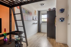 De tweede verdieping verrast met een royale derde slaapkamer, afgewerkt in dezelfde strakke stijl. Het grote dakkapel geeft extra ruimte en licht. Hier is tevens een airco geplaatst die in de zomer verkoelt en in de winter voor behaaglijke warmte zorgt. Op de overloop zijn de aansluitingen voor de cv-ketel en wasmachine handig weggewerkt.