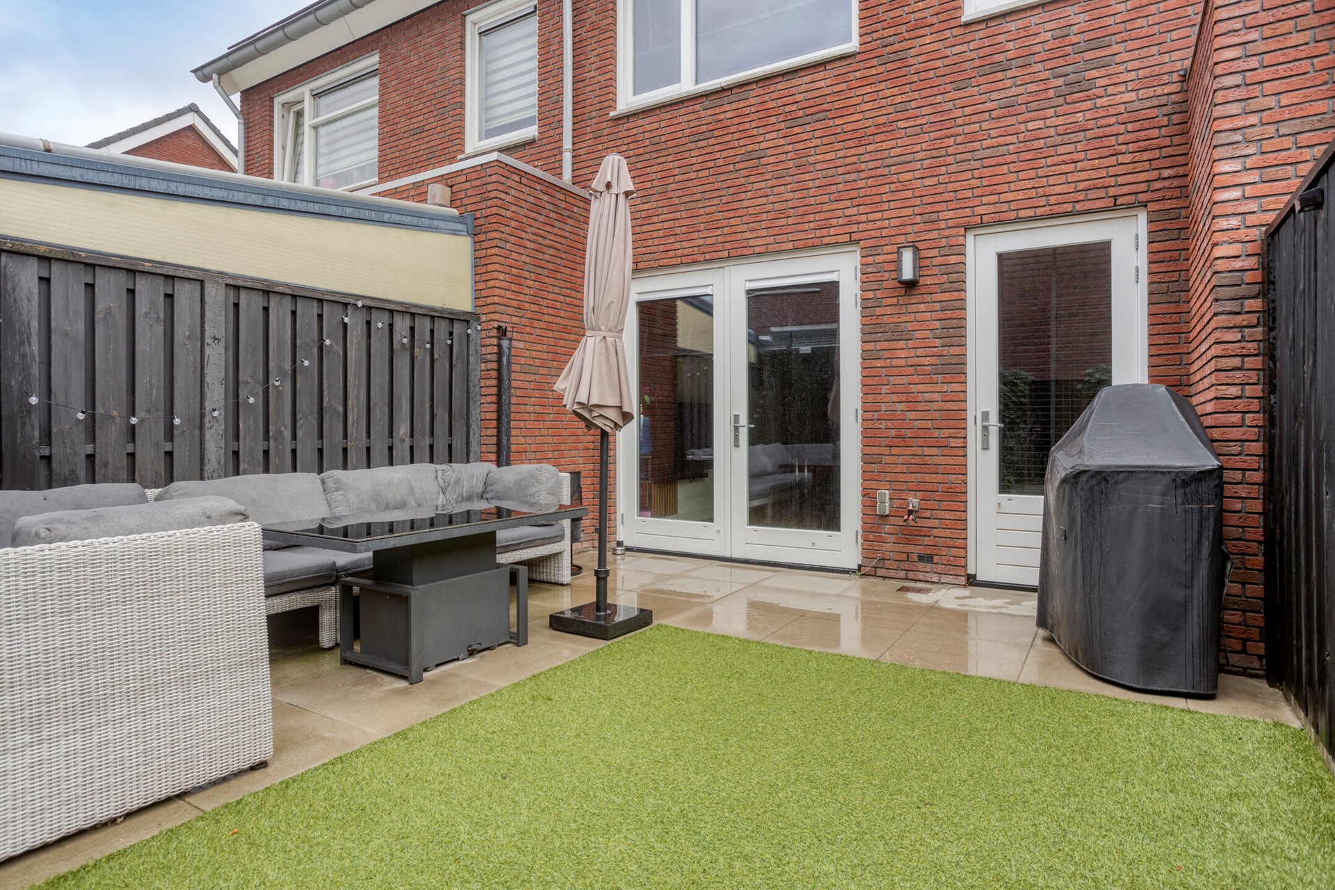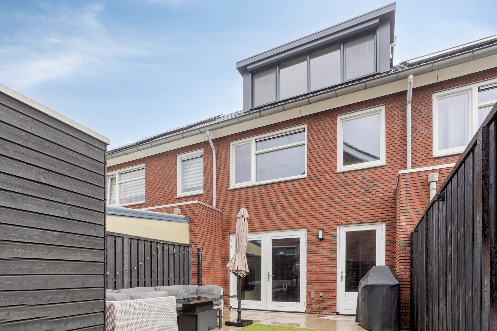 De tuin op het zuiden is strak aangelegd en onderhoudsvriendelijk, met moderne zwarte houten schuttingen en een praktische berging. Een plek om zomers lange dagen buiten te leven, zonder veel onderhoudszorgen.