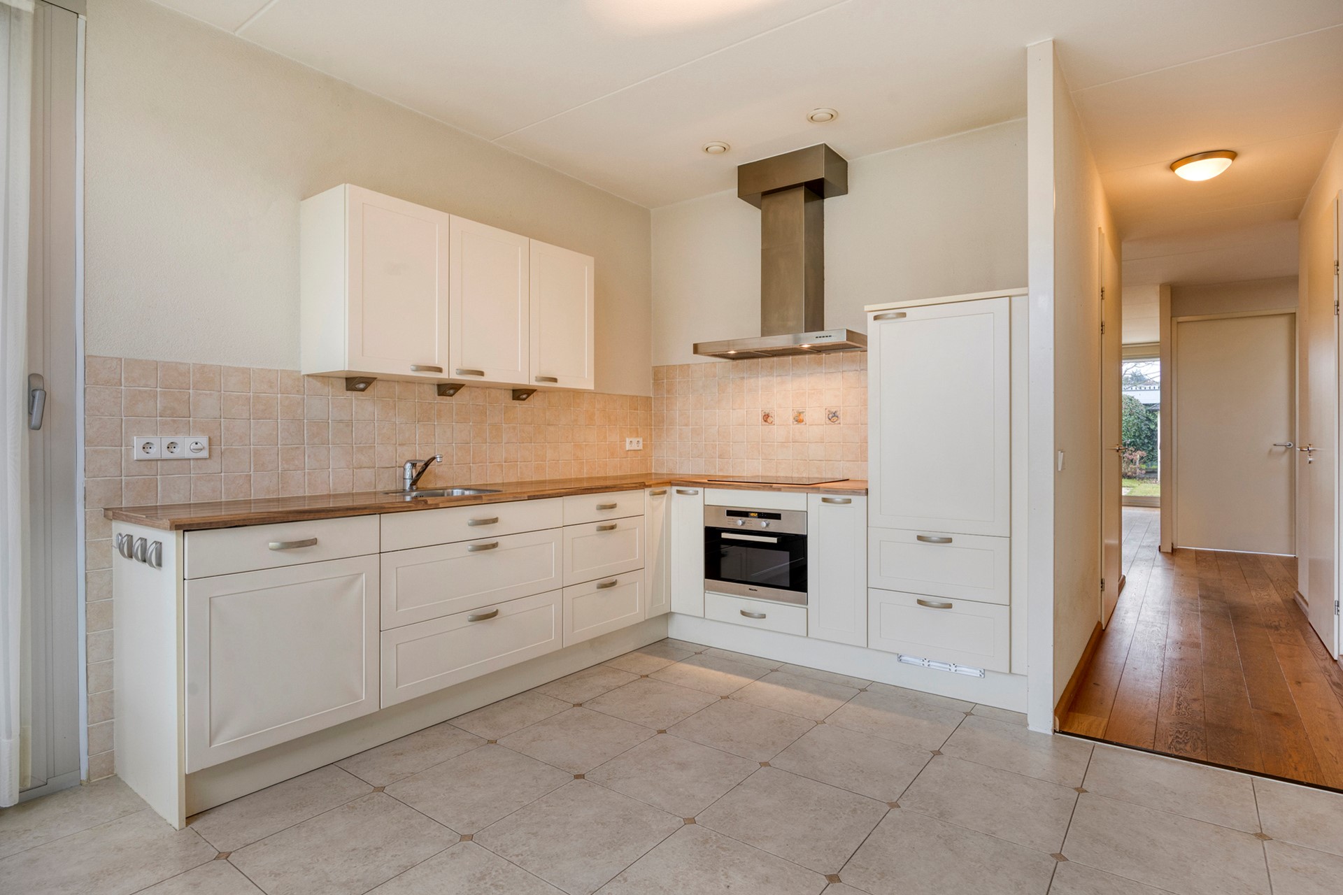 Aan de voorzijde ligt de keuken, een plek waar koken en samenzijn als vanzelf samengaan. De praktische opstelling, de nette afwerking en het uitzicht op de verzorgde voortuin zorgen voor een warme sfeer. Of je nu een snelle espresso maakt of uitgebreid kookt, hier voelt het altijd goed.