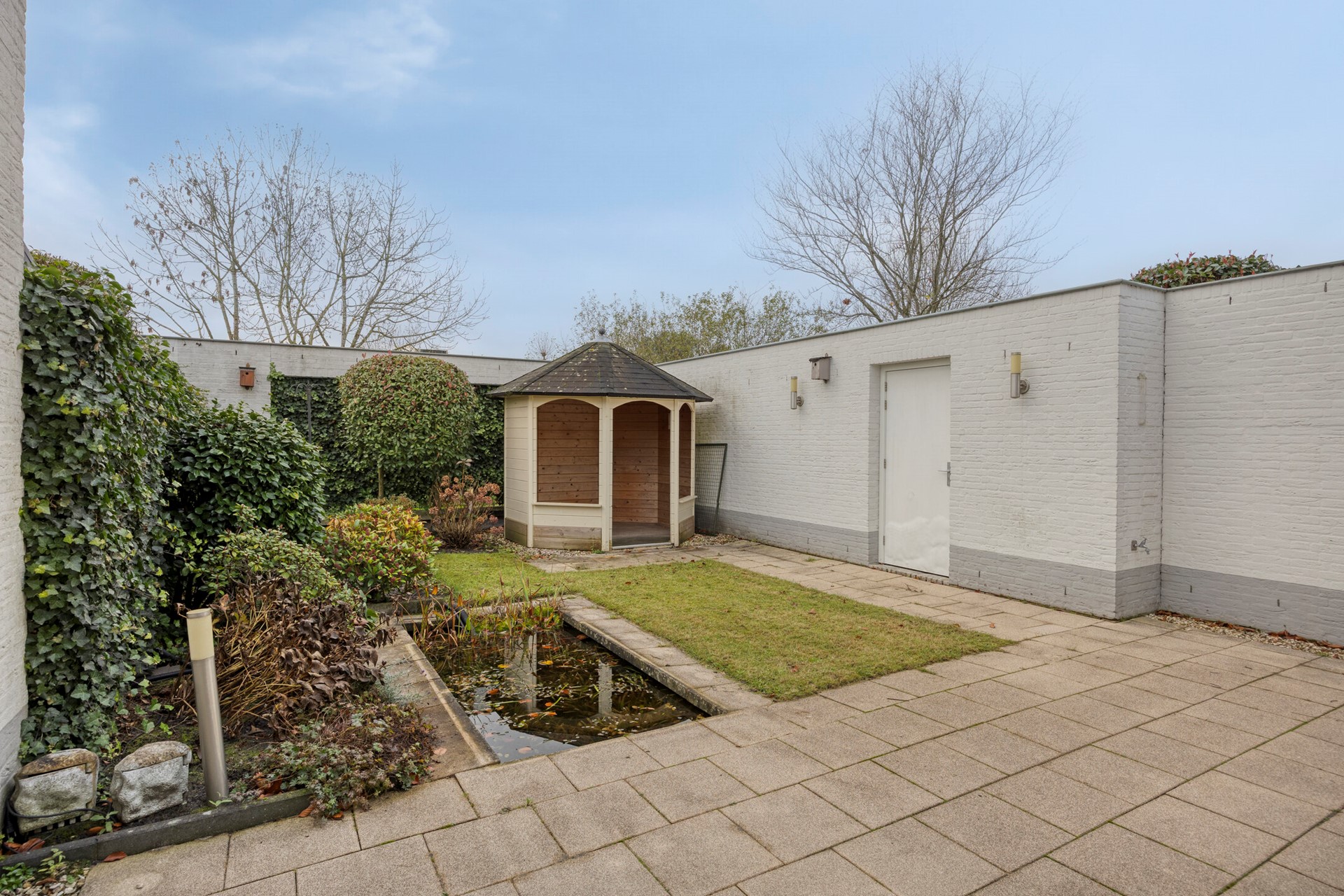 Aan de voorzijde ligt een verzorgde oprit met carport, maar de echte magie zit achter het huis. De achtertuin op het zuiden is een plek waar buitenleven met hoofdletters wordt geschreven. Privacy, zon, een speels gazon, een kleine vijver die zachtjes kabbelt — het voelt als een verstild vakantiehoekje, gewoon bij je thuis.