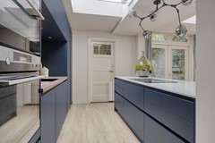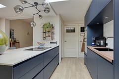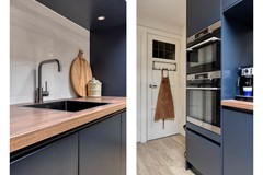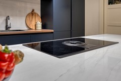 De moderne, donkerblauwe keuken vormt het hart van het huis. Riant opgezet met een schiereiland inclusief inductiekookplaat en geïntegreerd afzuigsysteem. Het dunne, lichte keramische werkblad en de donkere frontjes zorgen voor een moderne en stijlvolle uitstraling. De keukenwand biedt veel kastruimte en is voorzien van een spoelbak, inbouw stoomoven en combi-magnetron, inbouwkoelkast en vriezer én een vaatwasser. Kortom alles voorhanden om met plezier te koken. Dankzij de lichtkoepel baadt de ruimte in natuurlijk daglicht, waardoor koken en samenzijn hier een feestje worden.