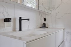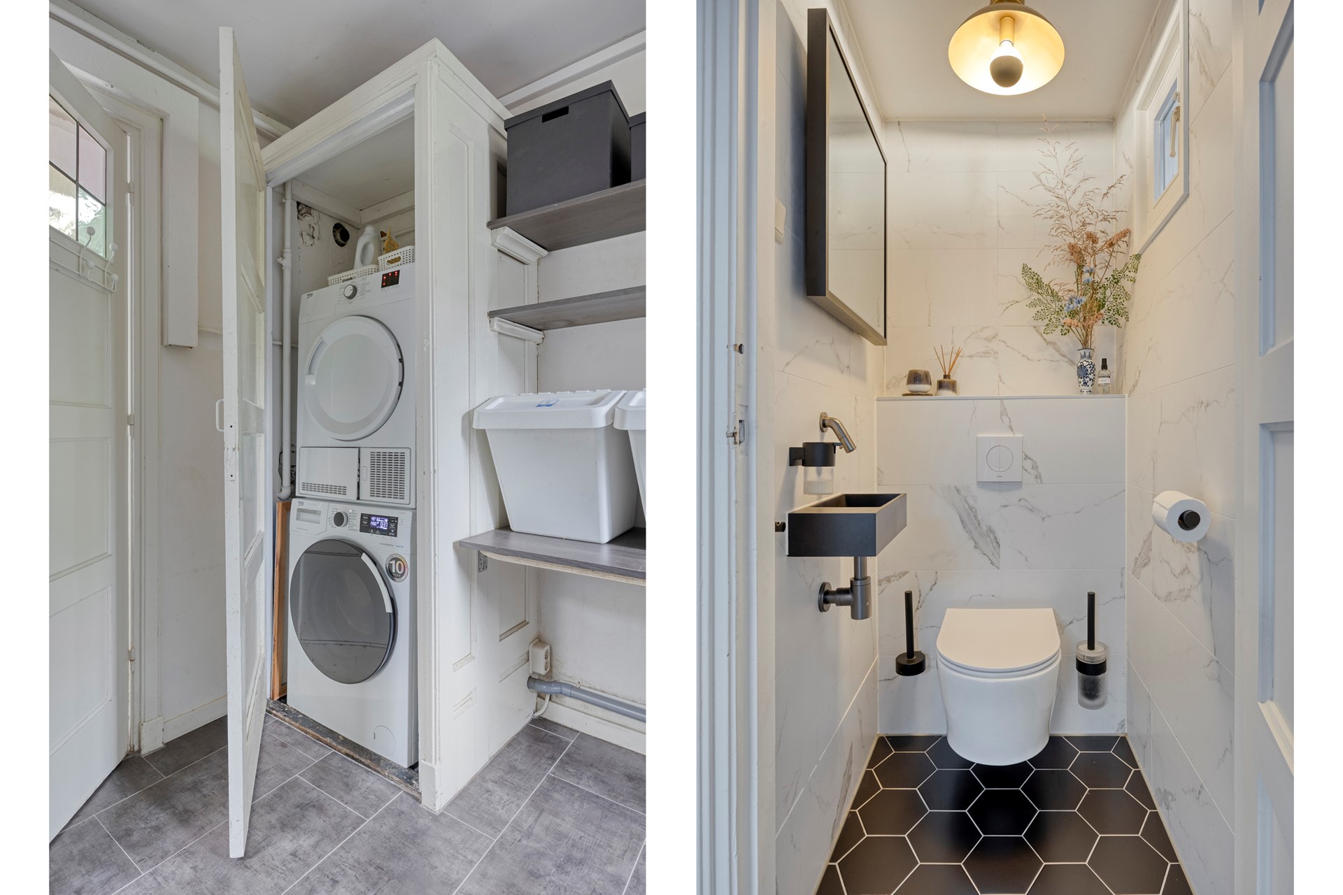 Achter de keuken ligt de bijkeuken, ideaal voor extra bergruimte en is voorzien van een wasmachineaansluiting. Hier vind je ook het strak afgewerkte toilet in dezelfde moderne stijl.