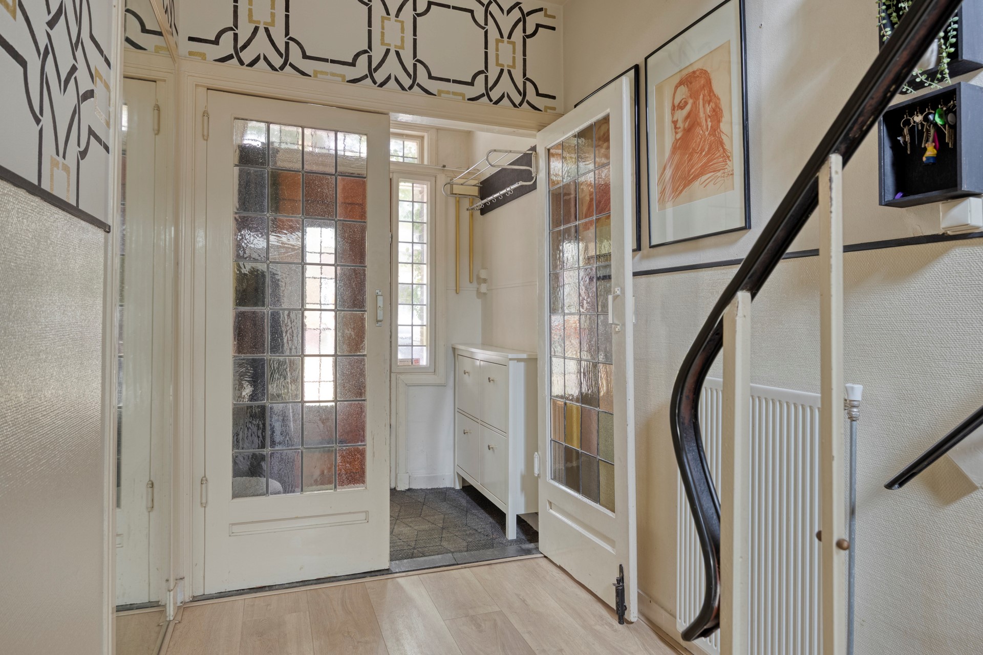 Al vanaf de voordeur ervaar je de charme van deze woning. De hal ademt jaren ’30 dankzij het tochtportaal met de prachtige openslaande glas-in-looddeuren. In de woonkamer zorgen de erker en glas-in-looddetails voor een warme, sfeervolle uitstraling die direct doet denken aan de rijkdom van die bouwperiode.