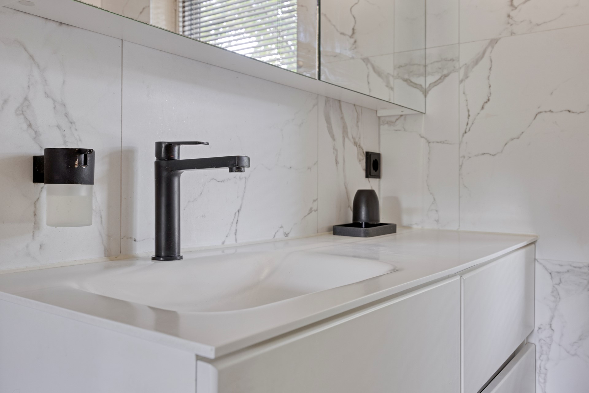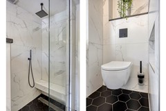 De trap leidt naar de eerste verdieping, waar vloerbedekking de slaapkamers en overloop een warme uitstraling geeft. Er zijn twee ruime slaapkamers en een badkamer die elegantie en luxe uitstraalt: een zwarte honingraat tegelvloer, wit marmerlook wandtegels, zwarte accenten, een breed wastafelmeubel én een toilet. Vanaf de overloop stap je zo het dakterras op, wat een verlengde kan zijn van de tuin om heerlijke in alle rust buiten te zitten.