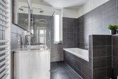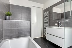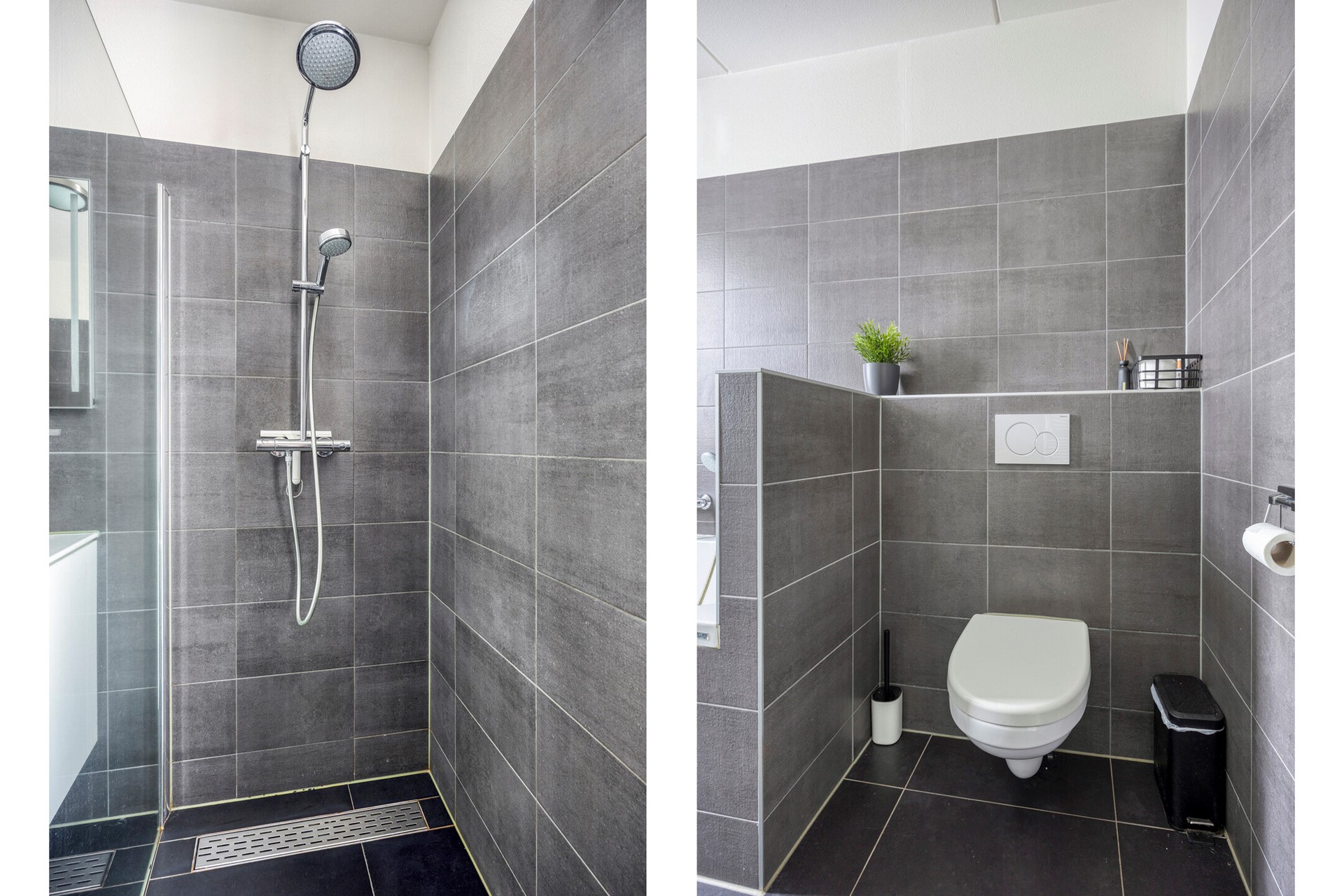 De badkamer is modern en verzorgd uitgevoerd en afgewerkt met donkergrijze tegels. Hier vind je een ligbad, een inloopdouche, een toilet en een wastafelmeubel. Een comfortabele en stijlvolle ruimte waar de dag ontspannen begint en rustig eindigt.