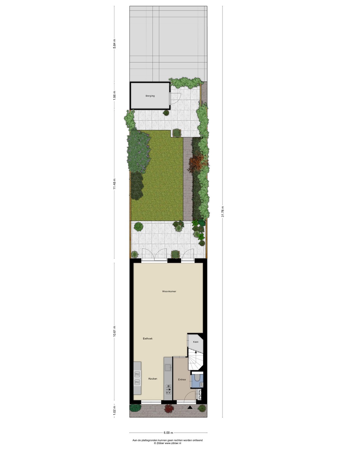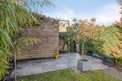 De fraai aangelegde tuin is een fijne combinatie van groen en bestrating. Er is een ruim terras voor een tuinset, een verzorgd gazon en plantenborders die zorgen voor een prettige en natuurlijke uitstraling. De tuin beschikt over een houten berging en een praktische achterom.