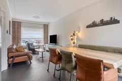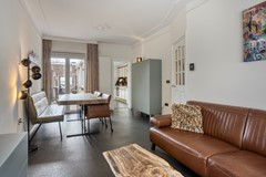 De woonkamer is ruim opgezet en ademt stijl. De hoge plafonds, sierlijsten en ornamenten geven de ruimte een klassieke uitstraling met een vleugje grandeur. Het daglicht valt gul naar binnen en benadrukt de zachte kleuren en strakke afwerking. Vanuit de eettafel kijk je uit richting de tuin en via de openslaande deuren verbind je binnen moeiteloos met buiten.
