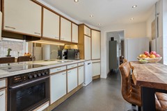 De keuken, gelegen achter de woonkamer, is praktisch en toch sfeervol. Met een kookplaat, een brede oven, vaatwasser én koelkast is dit een plek waar koken weer echt een belevenis wordt. Het aanrecht langs de lange wand biedt volop werkruimte, terwijl het keukenraam zorgt voor extra licht en verbinding met buiten.
