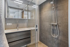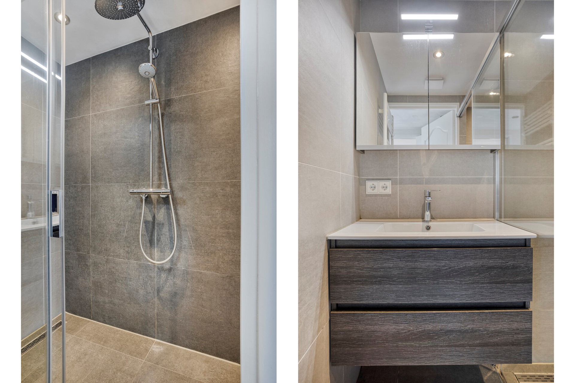 De bijkeuken verbindt functionaliteit met comfort: hier vind je de aansluiting voor de wasmachine en de toegang tot het toilet én de badkamer. Zowel de badkamer als het separate toilet zijn uitgevoerd in dezelfde moderne stijl, wat zorgt voor een strakke, luxe en uniforme uitstraling. De badkamer is volledig betegeld en beschikt over een ruime inloopdouche, een wastafel met wandmeubel en een spiegelkast die de ruimte licht en praktisch maakt.