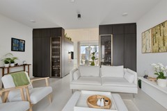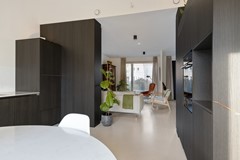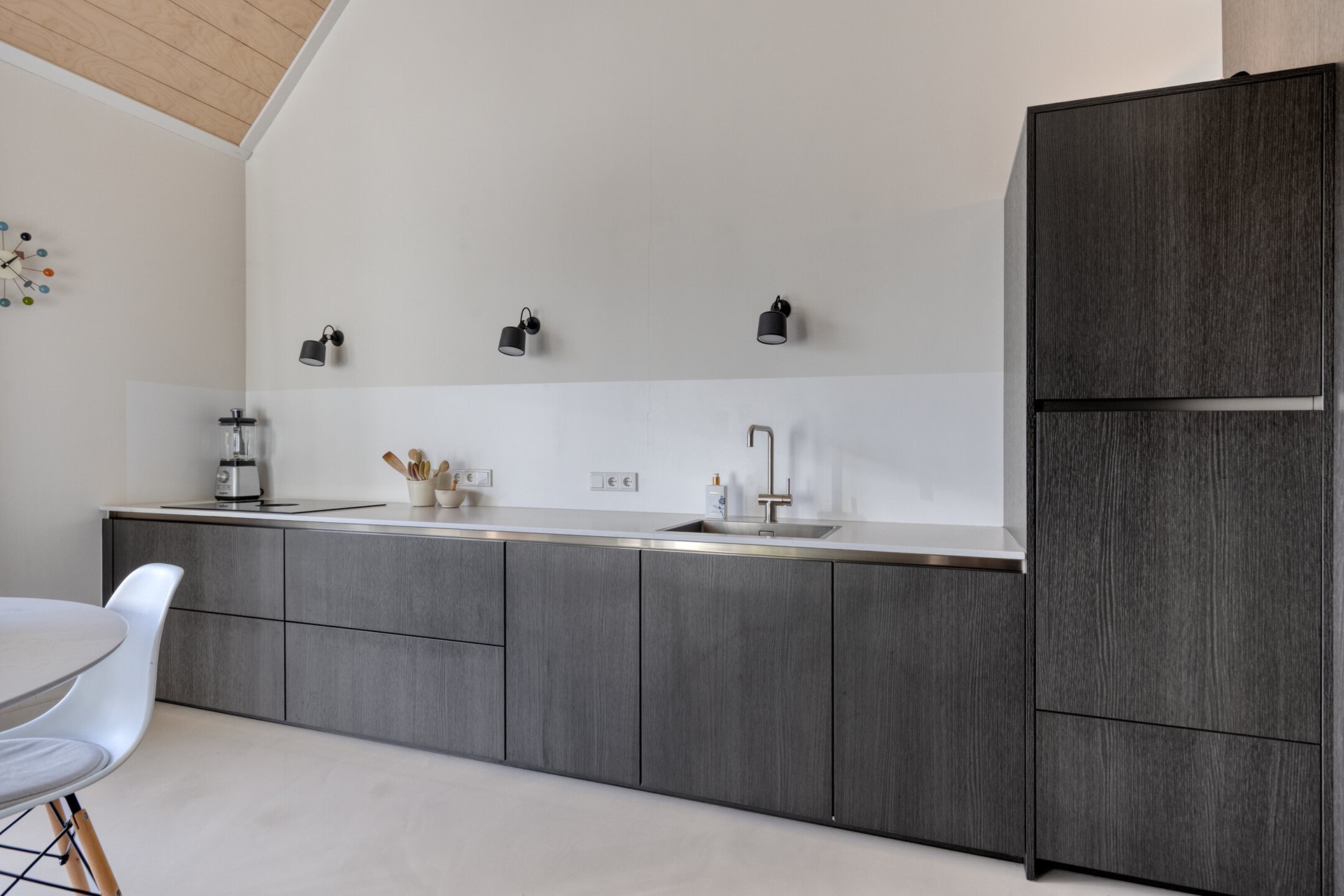 Het hart van de woning is zonder twijfel de open keuken. Met een plafondhoogte van maar liefst 5,5 meter voelt deze ruimte groots en licht aan. De maatwerk Siematic keuken is een lust voor het oog: strak, modern en tot in detail doordacht. De kookplaat met geïntegreerde kookveldafzuiging zorgt voor een minimalistisch kookeiland, terwijl de donkere kastenwand met oven op ooghoogte, warmhoudlade, koelkast én een ergonomisch geplaatste vaatwasser op werkhoogte (circa 45 cm boven de vloer) bijdraagt aan optimaal gebruikscomfort en een luxe hotelgevoel. Hier kook je niet alleen, hier beleef je.