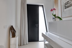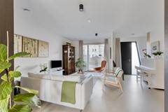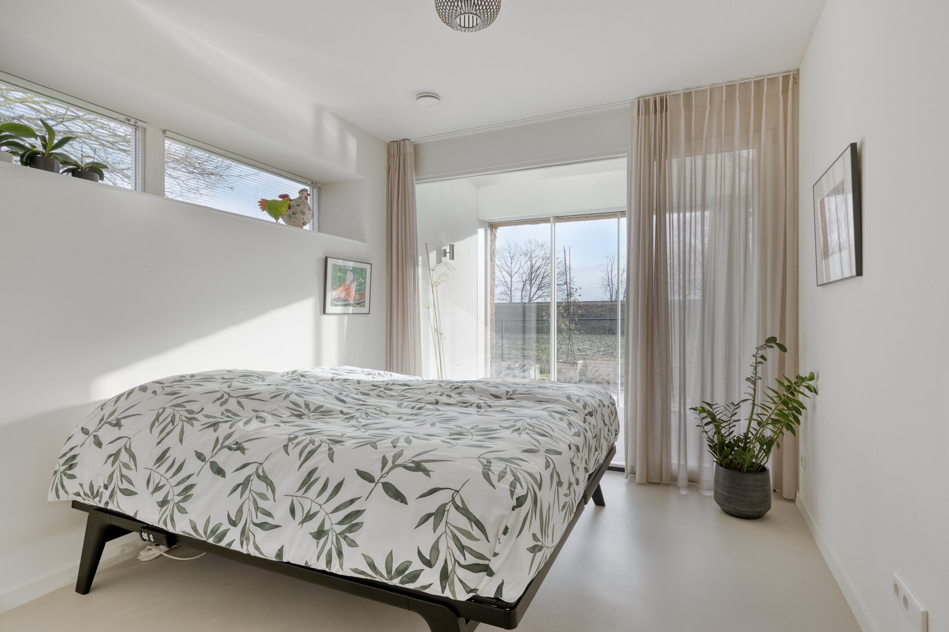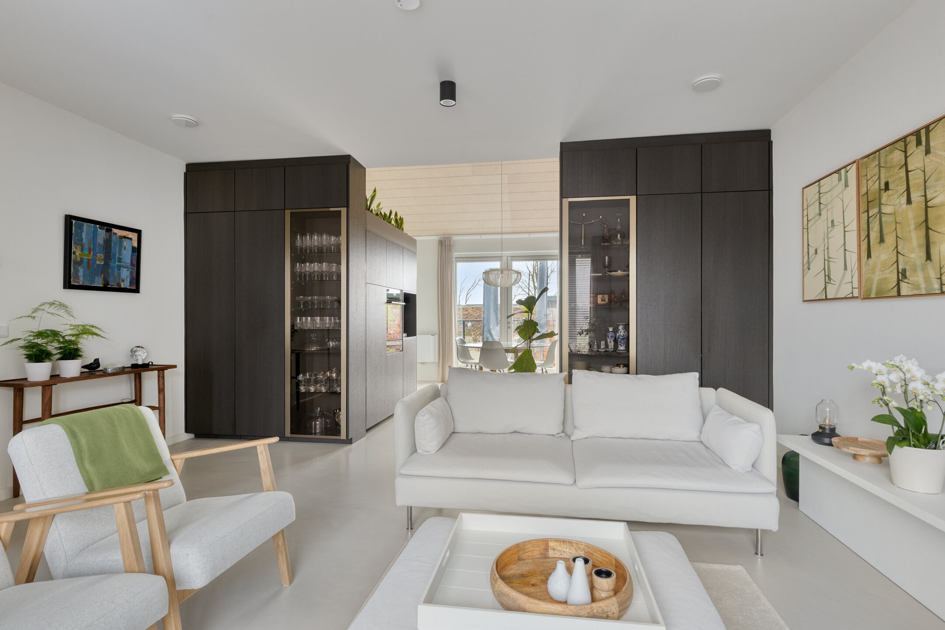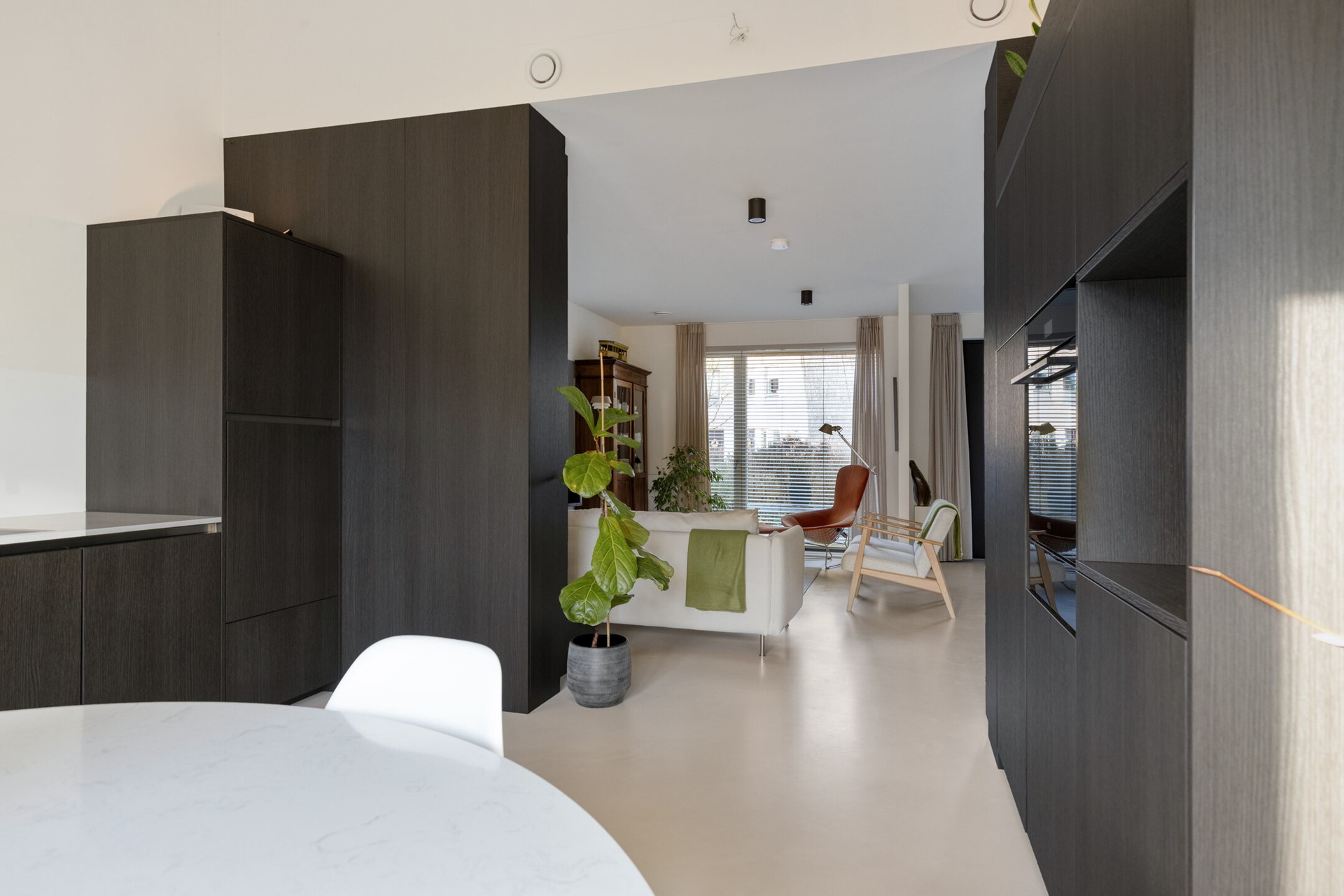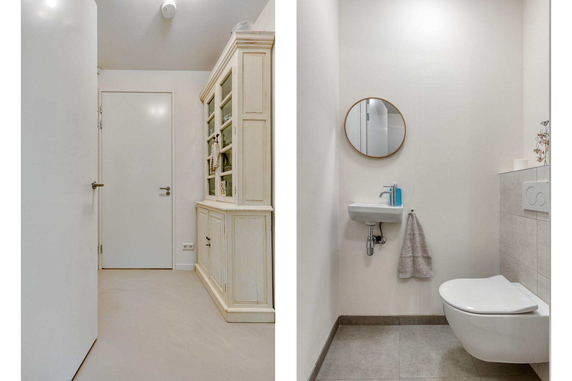 Stap binnen en ervaar direct de serene sfeer. De begane grond is afgewerkt met een strakke gietvloer die rust en eenheid brengt. Het daglicht stroomt rijkelijk naar binnen en versterkt het ruimtelijke gevoel dat overal in huis aanwezig is.