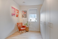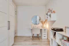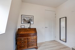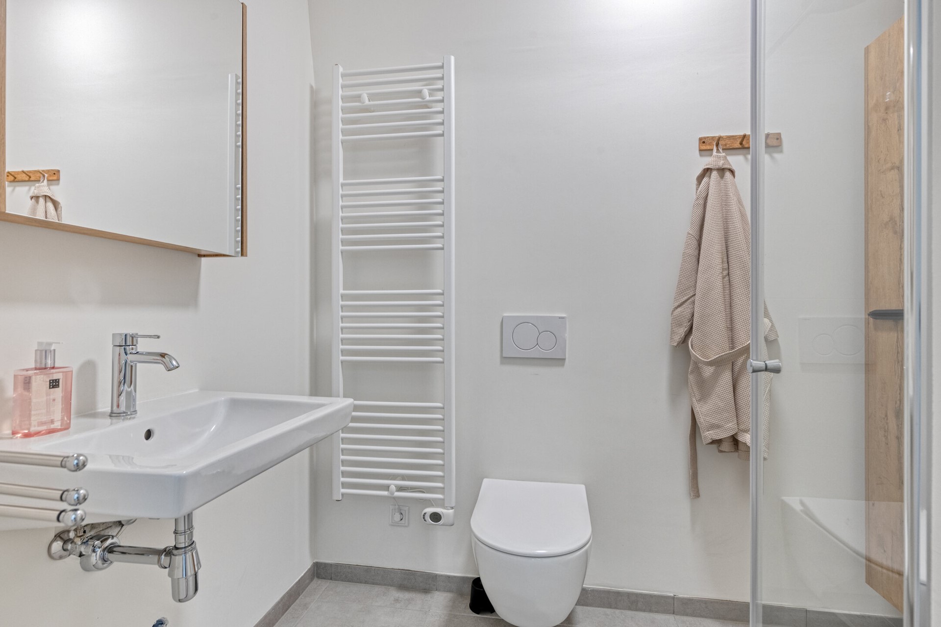 Op de eerste verdieping bevinden zich drie fijne slaapkamers, een tweede badkamer met douche, wastafel en toilet én een praktische berging/wasruimte. De houtlook laminaatvloer geeft de verdieping een warme uitstraling, terwijl ook hier de badkamer strak is betegeld.