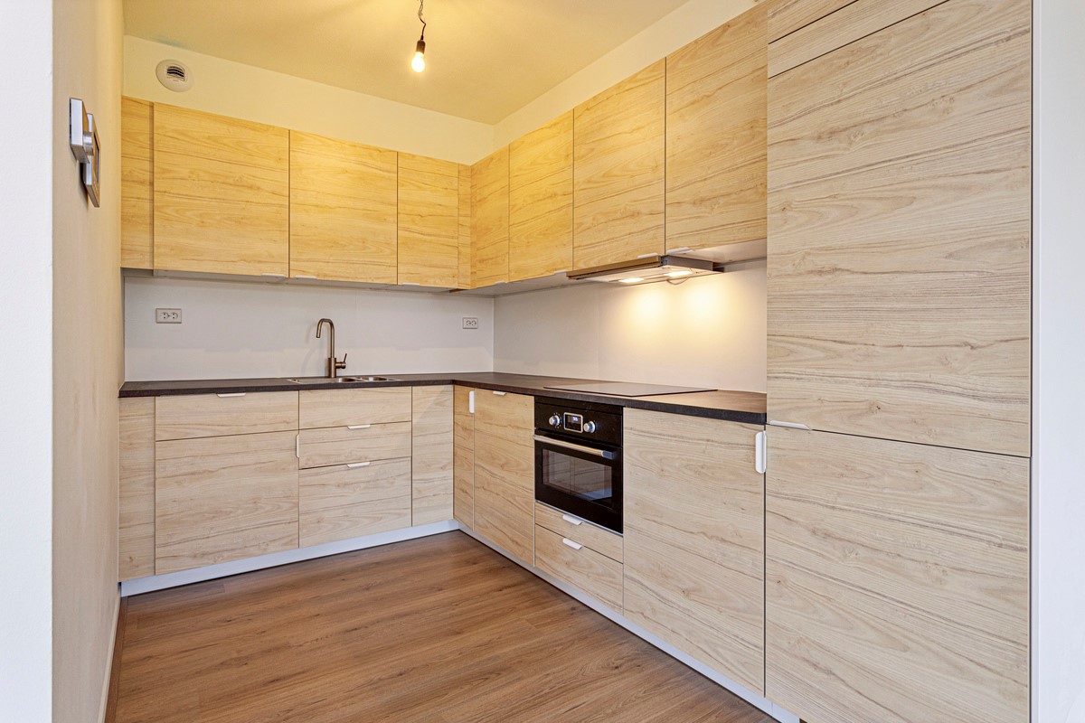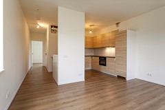 De woonkamer van 29 m² vormt het hart van de woning: een lichte leefruimte waar de houtlook laminaatvloer, de zachte lichtinval en de frisse, open indeling zorgen voor een ontspannen ambiance. Een plek waar je graag neerstrijkt — of je nu een rustig avondje plant of vrienden ontvangt.
