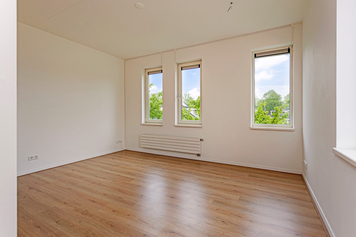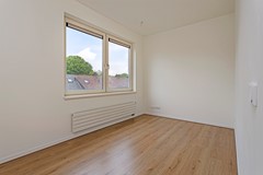 Aan de achterzijde vind je de royale slaapkamer, waar de houtlook laminaatvloer vanuit de woonkamer harmonieus doorloopt. Dit geeft de ruimte een warme en rustige uitstraling. De ligging aan de rustige zijde van het complex zorgt voor stille nachten en relaxte ochtenden — precies zoals een slaapkamer bedoeld is.