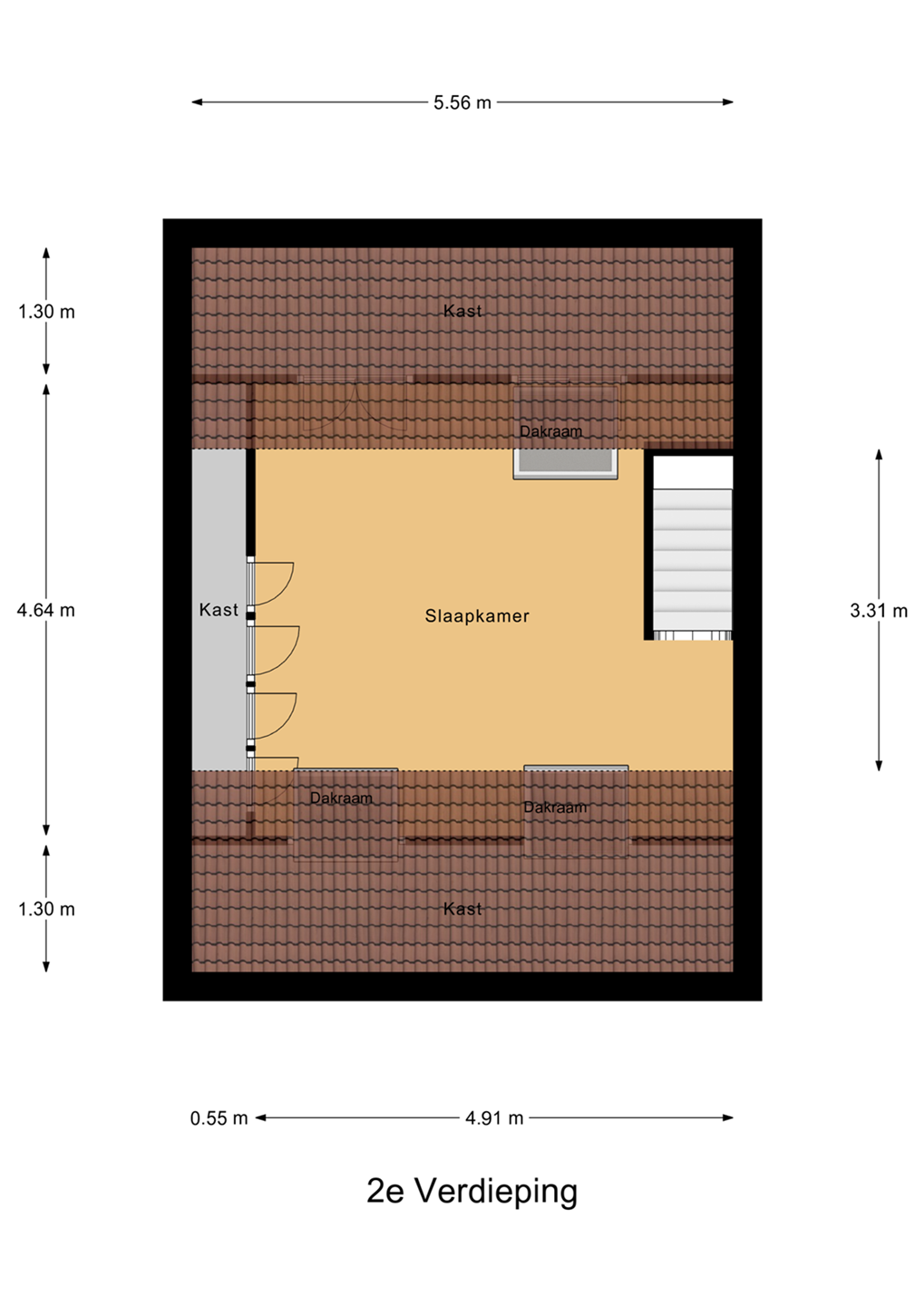 De tweede verdieping verrast met een royale master bedroom. Dankzij de drie Velux-dakramen is dit een lichte ruimte, compleet met meerdere inbouwkasten. Achter de knieschotten vind je bovendien handige bergruimte. ook deze verdieping is netjes afgewerkt en voorzien van een laminaatvloer.
