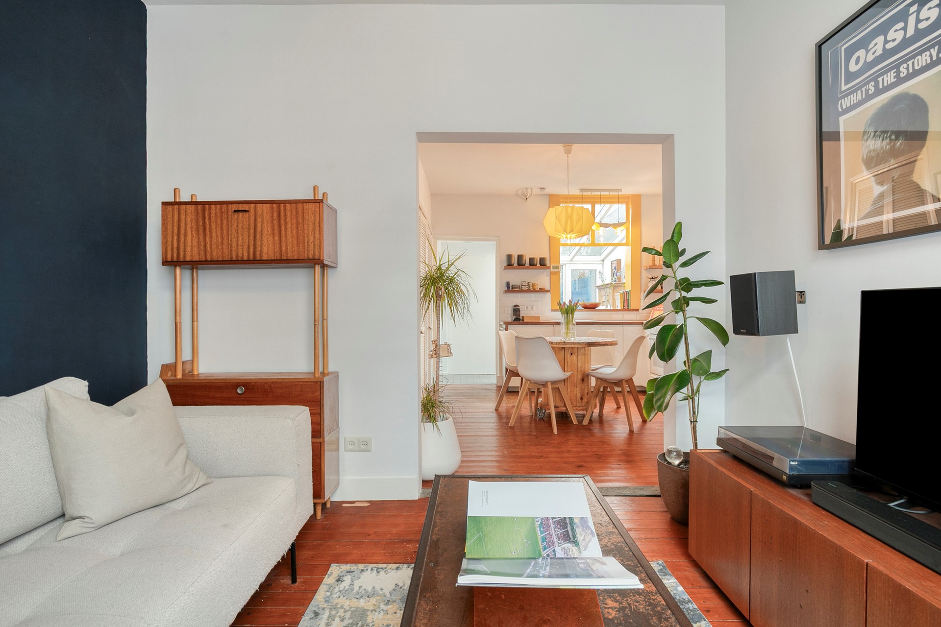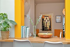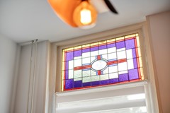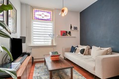 Aan de voorzijde van de woning bevindt zich de sfeervolle woonkamer. Hoge plafonds geven een ruimtelijk gevoel en het glas-in-loodraam zorgt voor een prachtig spel van licht en kleur. Een heerlijke plek om tot rust te komen, met behoud van de karakteristieke elementen die deze woning zo bijzonder maken.
