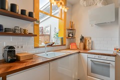 Via de entree stap je direct de lichte woonkeuken binnen – een plek waar koken, leven en samenzijn samenkomen. De keuken is praktisch ingericht en voorzien van een oven, vaatwasser, kookplaat en moderne afzuigkap. De authentieke houten vloerdelen lopen naadloos door richting de woonkamer aan de voorzijde en zorgen voor een warme, natuurlijke uitstraling. Extra fijn: er is een kast én een berging aanwezig, ideaal voor voorraad en extra bergruimte.
