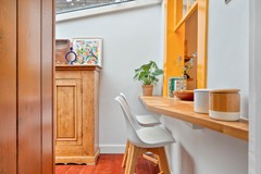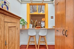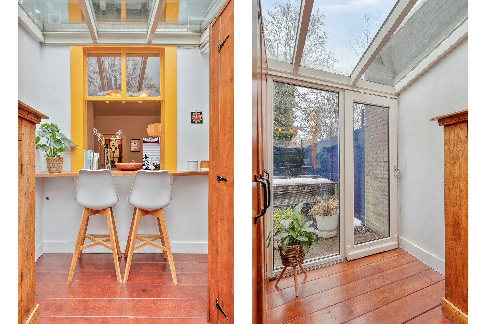 Achter de keuken ligt de serre – een verrassende en gezellige ruimte met een bargedeelte bij het keukenraam. Hier ontstaat een speels en warm contact tussen keuken en serre, perfect voor lange avonden, een goed glas wijn of een ontspannen ontbijt. Vanuit de serre loop je zo de achtertuin in, waardoor binnen en buiten moeiteloos in elkaar overlopen.