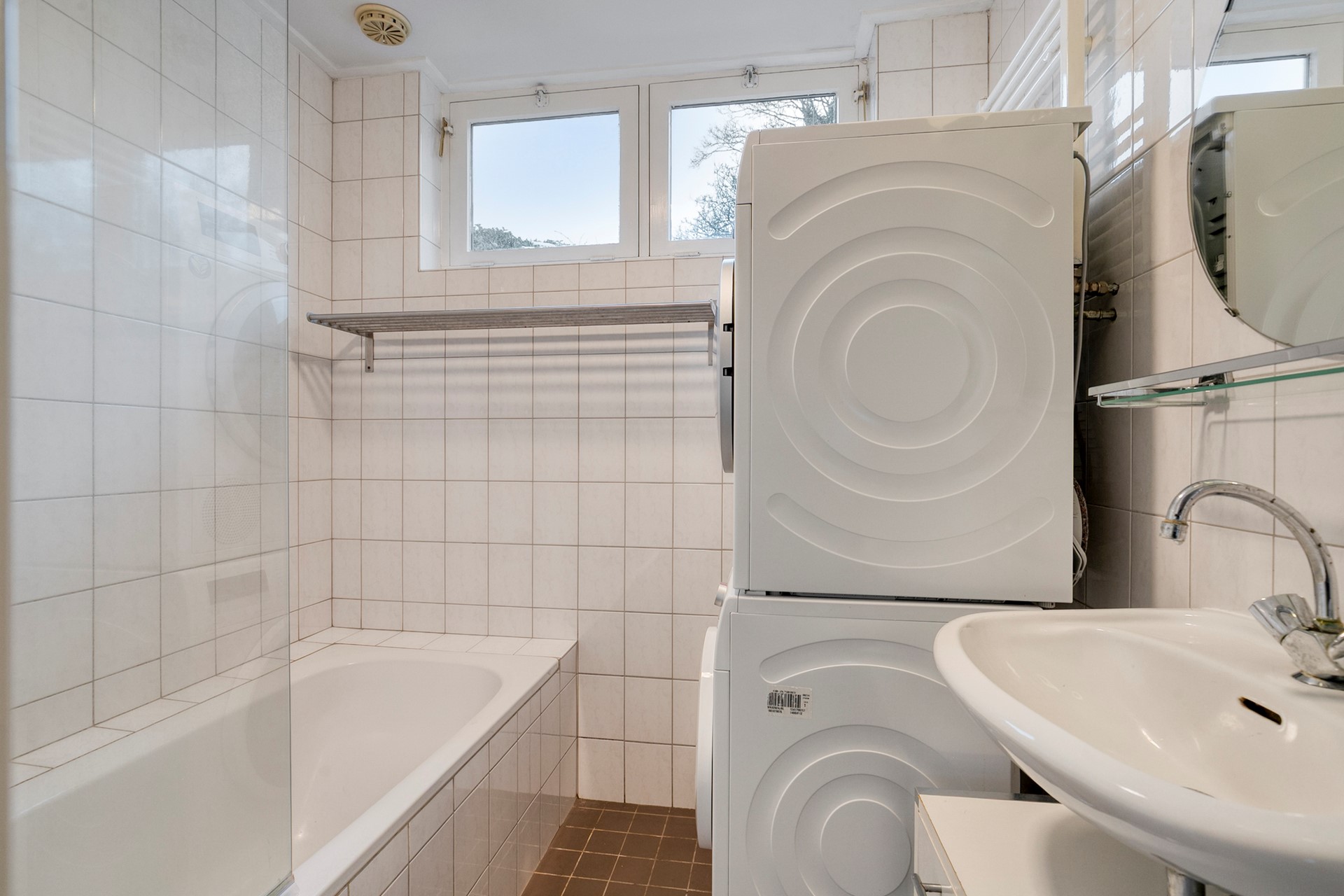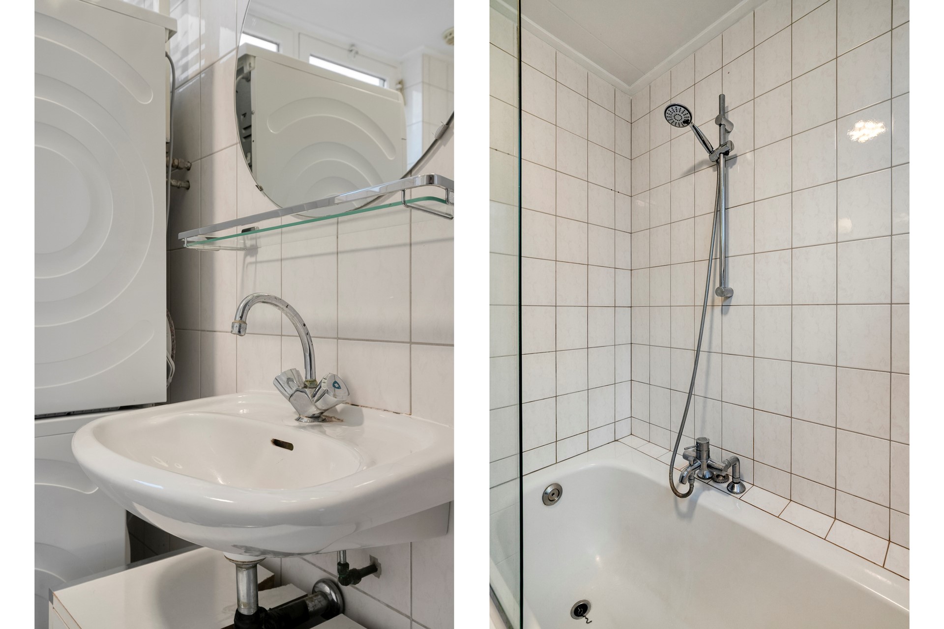 Via de keuken heb je tevens toegang tot het separate toilet en de badkamer, gelegen naast de serre. De badkamer is volledig betegeld en uitgerust met een ligbad en een wastafel met ondermeubel: praktisch, verzorgd en comfortabel.