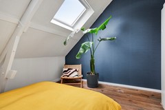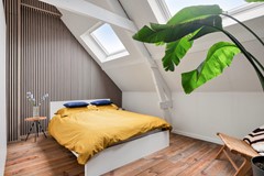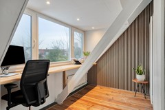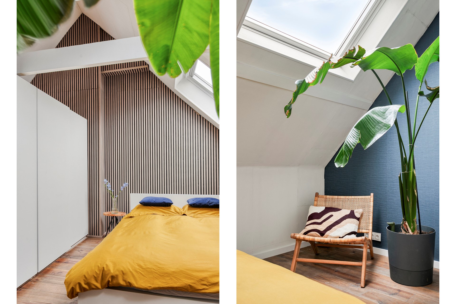De eerste verdieping verrast met een royale, loftachtige slaapkamer. Aan de voorzijde zorgen twee dakramen voor een prettige lichtinval, terwijl aan de achterzijde een dakkapel is geplaatst met een fijne thuiswerkplek. Door het slim plaatsen van een kastenwand in het midden van de ruimte is er op speelse wijze een extra slaapkamer aan de voorzijde gecreëerd. Het hoge plafond en de wit gelakte spanten versterken het ruimtelijke gevoel en geven deze verdieping een unieke, bijna atelierachtige sfeer.