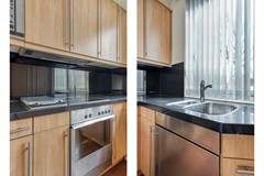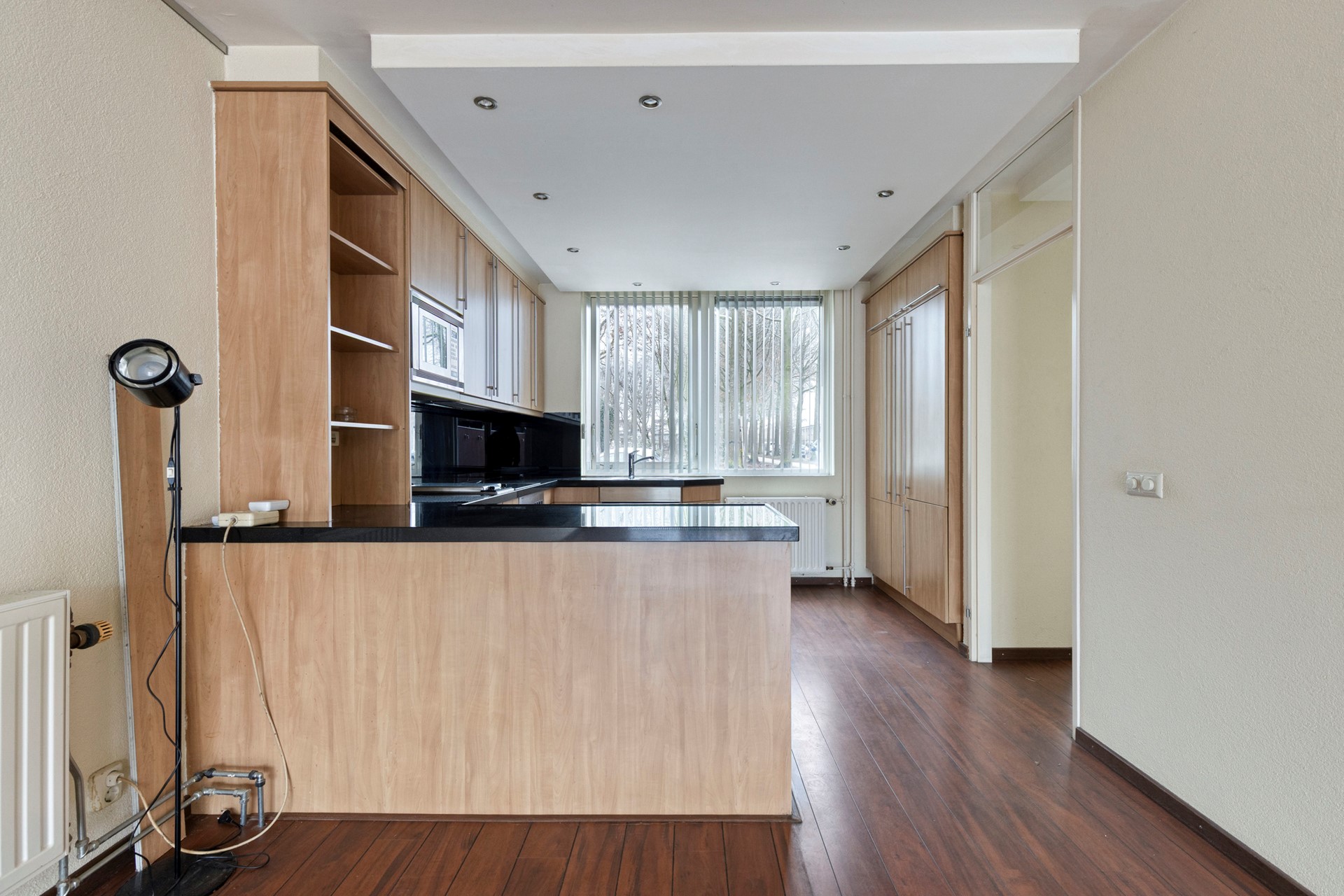 De open keuken aan de voorzijde heeft een moderne houtlook uitstraling die warmte en karakter toevoegt aan de ruimte. De keuken is voorzien van alle gemakken: een inductiekookplaat, oven, koelkast, vaatwasser, afzuiging en vriezer. Terwijl je kookt, kijk je uit over het groene speelveld voor de woning – een levendig uitzicht dat nooit verveelt.