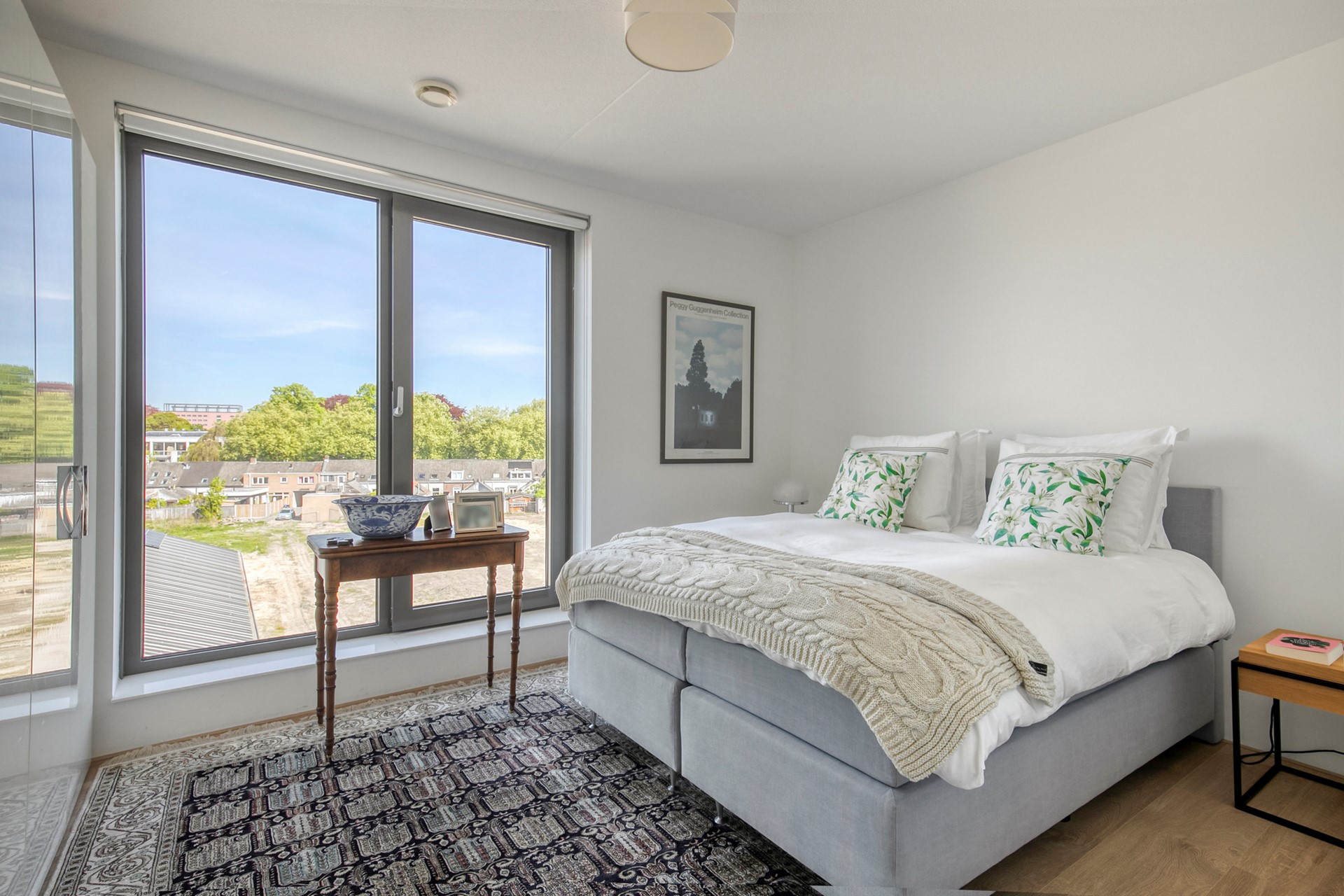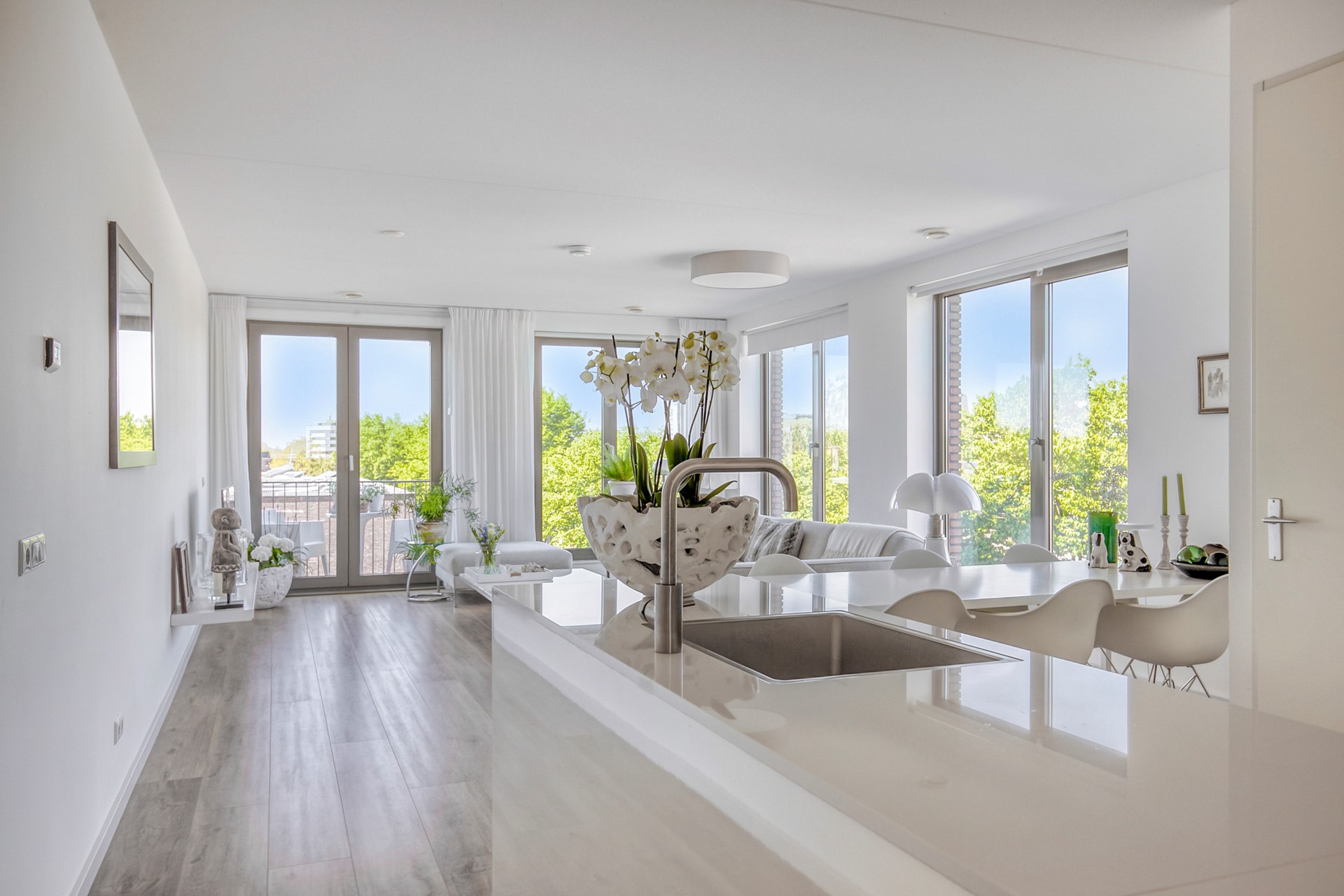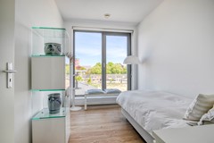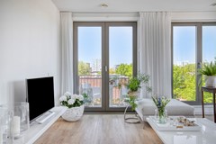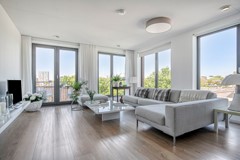 Bij binnenkomst in de grote, lichte woonkamer met indrukwekkend uitzicht, springen meteen de grote ramen en het balkon in het oog. Doordat het een hoekappartement is, bestaat de woonkamer uit twee grote raampartijen wat zorgt voor een wow-factor! De ramen op de westkant van de woonkamer beschikken tevens over buitenzonwering