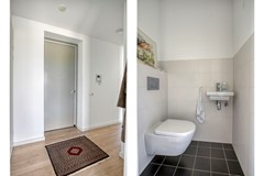 woonkamer/keuken. Het toilet is betegeld met lichte wandtegels, donkere vloertegels en beschikt over een zwevend toilet en fonteintje.