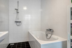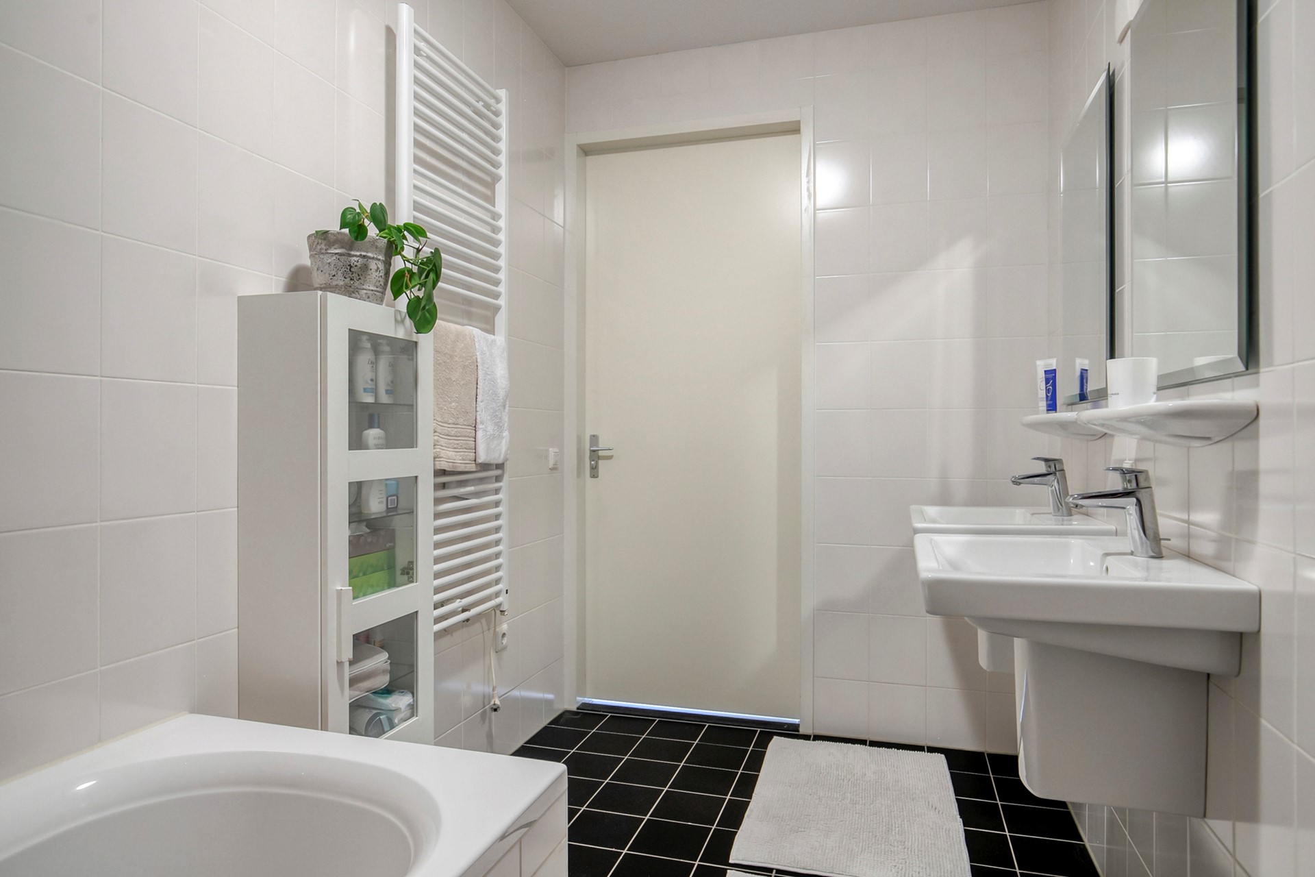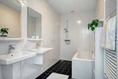 De moderne badkamer is volledig betegeld met witte wandtegels en een donkere vloertegel. De badkamer is voorzien van een twee wastafels, een designradiator, een douche en een ligbad.