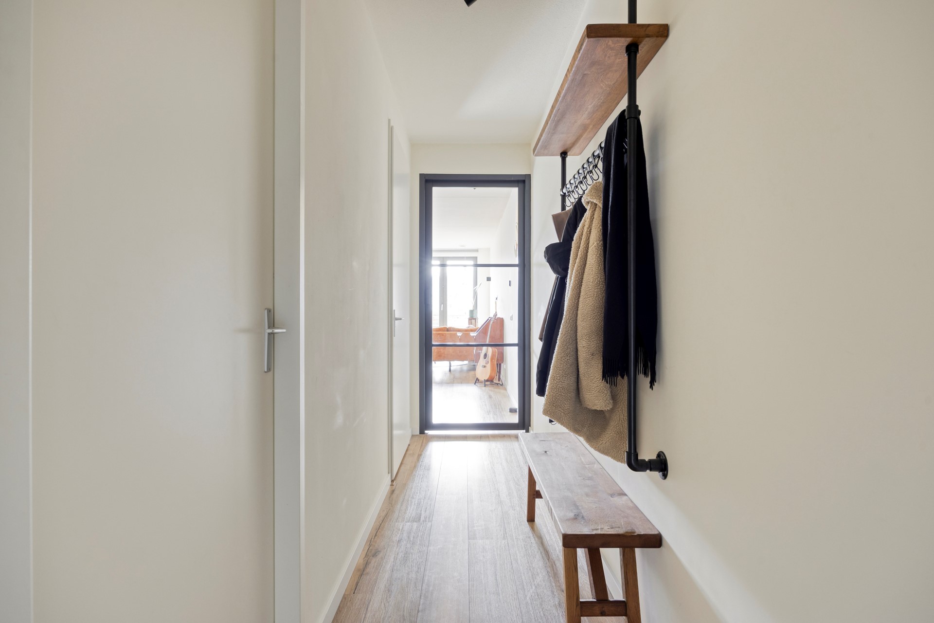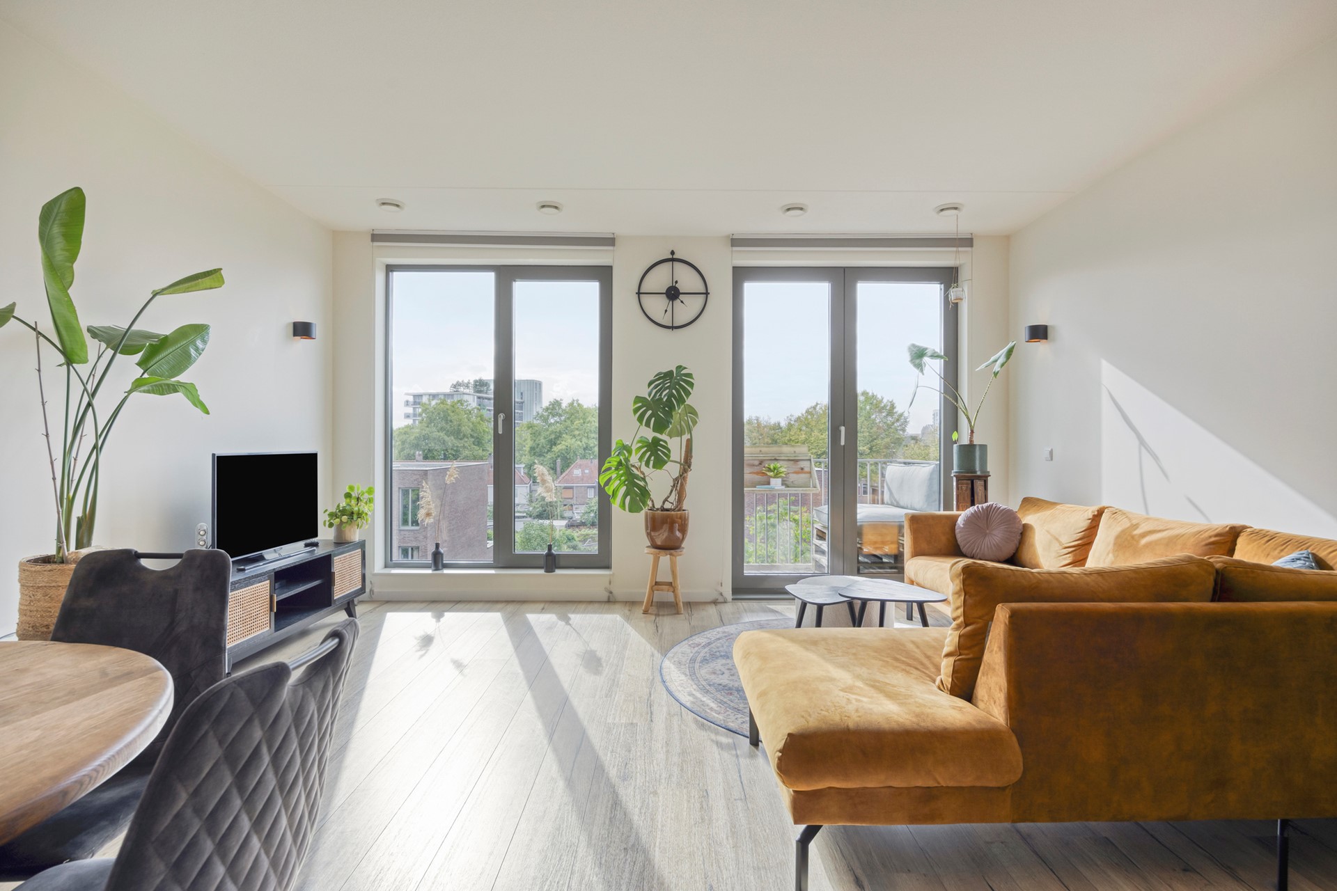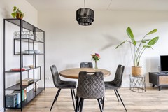 De woonkamer is voorzien van een mooie parketvloer, die warmte en stijl toevoegt aan de ruimte. Dankzij de neutrale basis kun je hier direct jouw eigen sfeer creëren. En door de gezellige wandspots voelt het hier ook in de avonduren knus, licht en ruim.