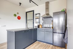 De open keuken is praktisch en inventief ingericht, waardoor hij compleet uitgerust is met een gasfornuis, combi-oven/combimagnetron en vaatwasser, zonder dat het daarbij aan kastruimte ontbreekt. Dankzij de open, indeling heb je veel verbinding met de woonkamer, waardoor je tijdens het koken niets hoeft te missen van het dagelijks leven in huis. Alles wat je nodig hebt om heerlijk te koken én te genieten is hier aanwezig.