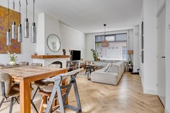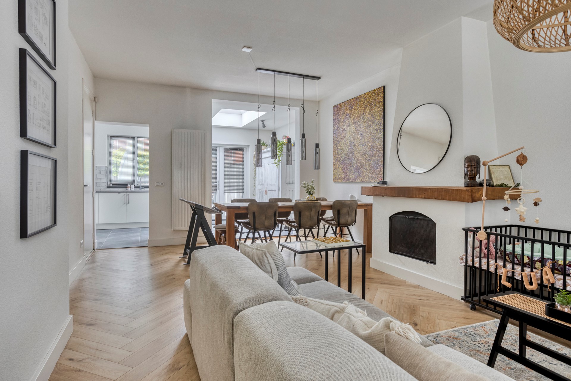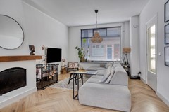 De hal geeft toegang tot de sfeervolle woonkamer met dezelfde visgraat vloer, gestuukte wanden en plafond, een gezellige houthaard en een praktische bergkast. Vanuit de woonkamer heb je middels een afgesloten trapopgang toegang tot de verdieping.